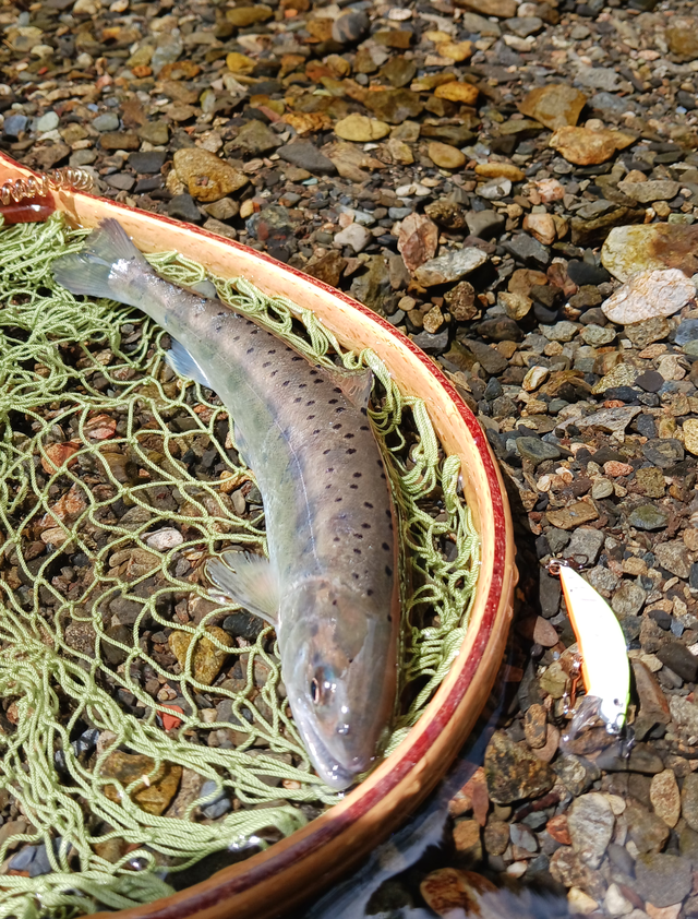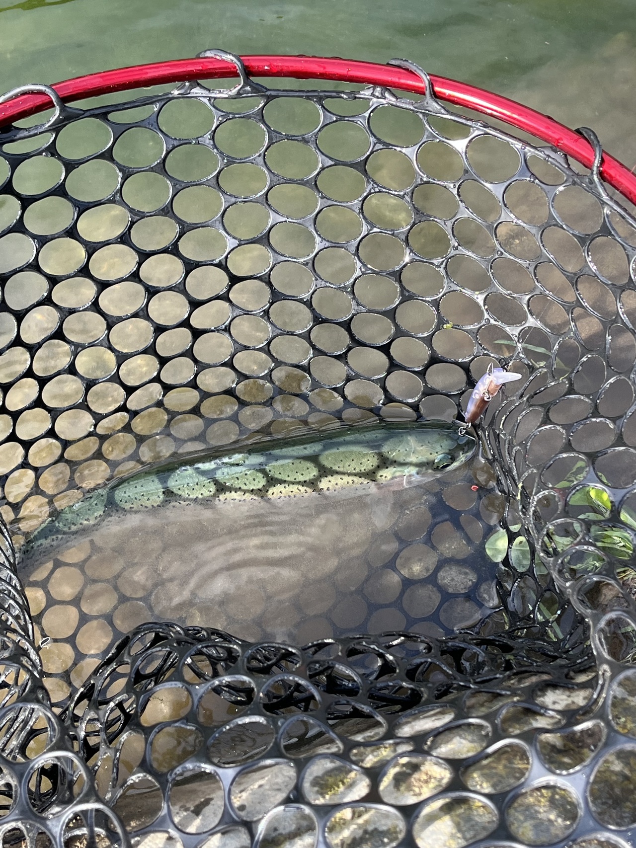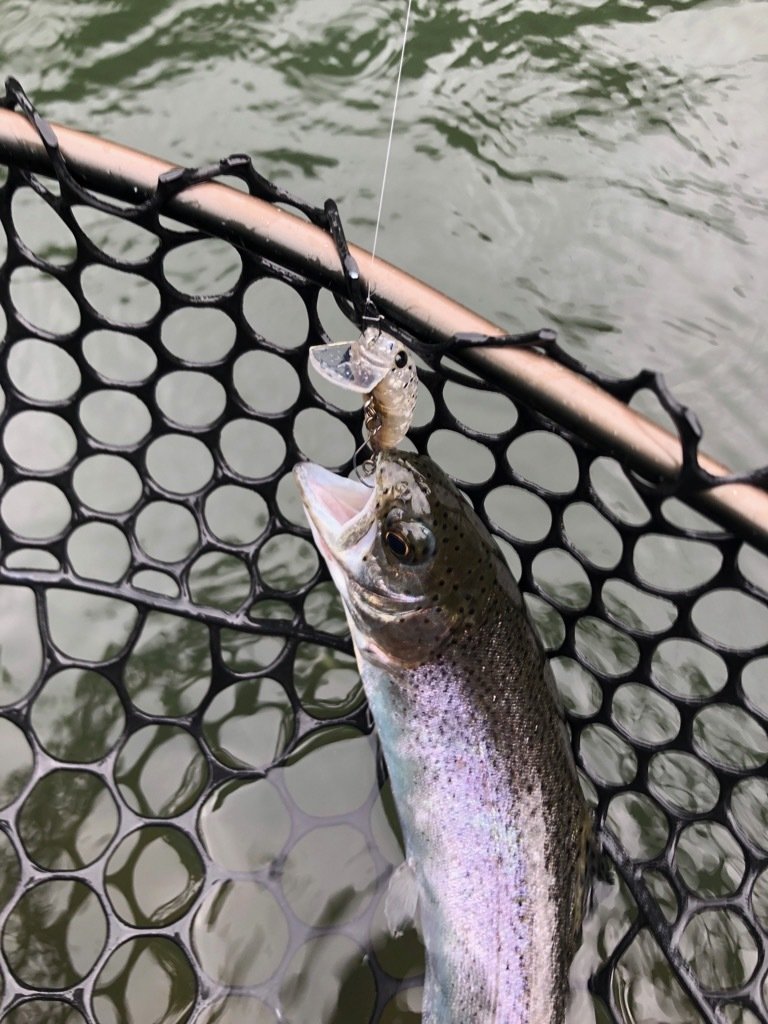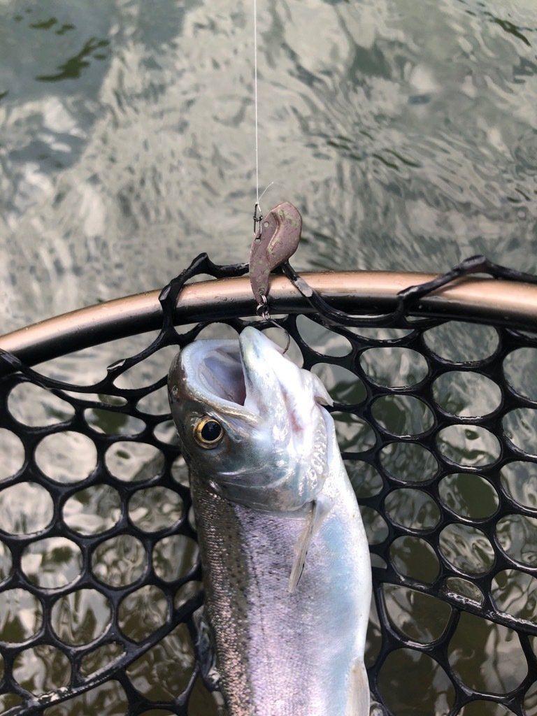 ルアーもとっかえひっかえいろいろ試しながら釣り上がっていくと、ニジマスがヒット。