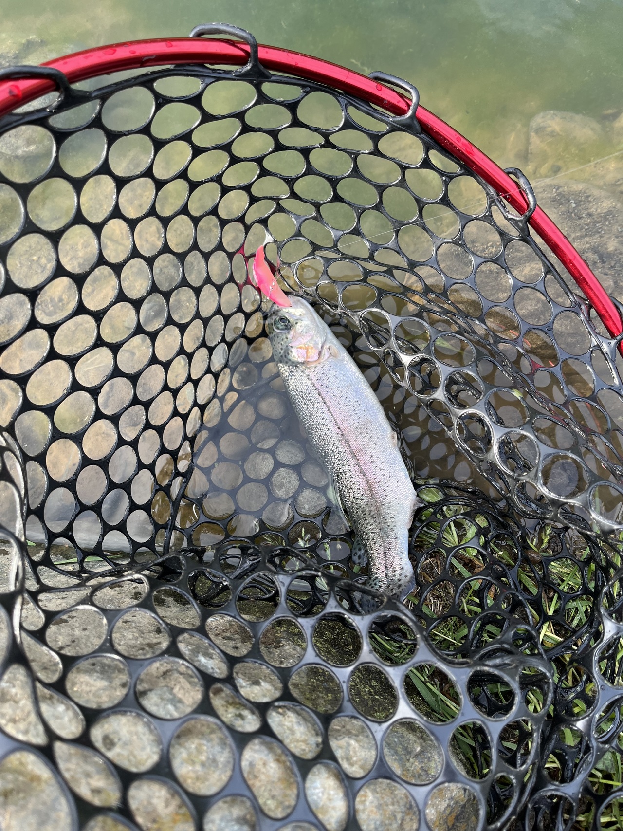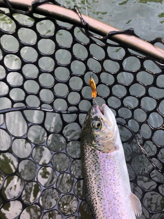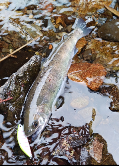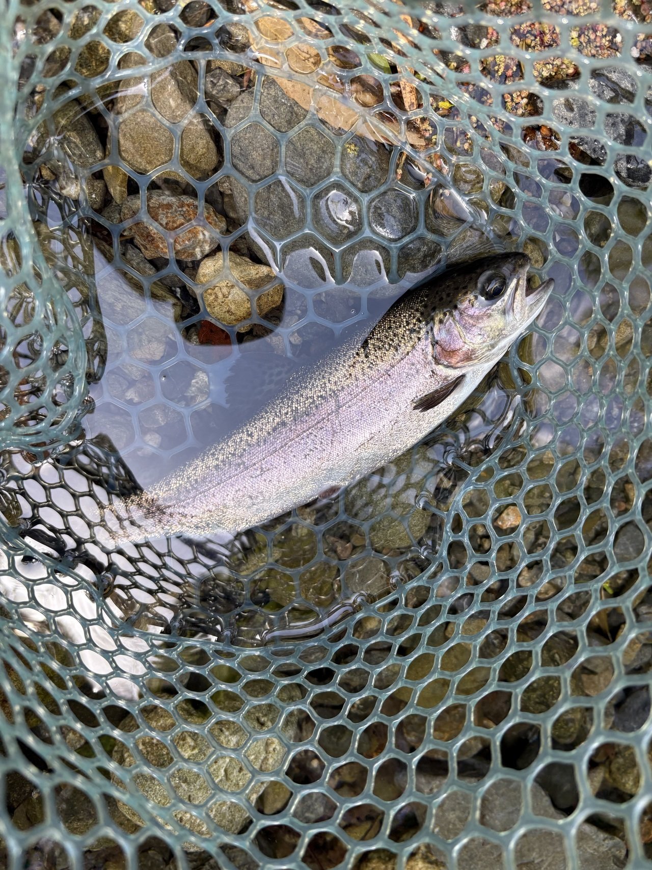 ルアーもとっかえひっかえいろいろ試しながら釣り上がっていくと、ニジマスがヒット。