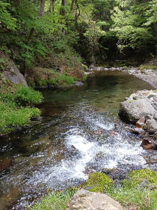 さらに上っていったところでようやくシーズン初ヤマメが釣れてくれました(撮影準備中に逃亡)。