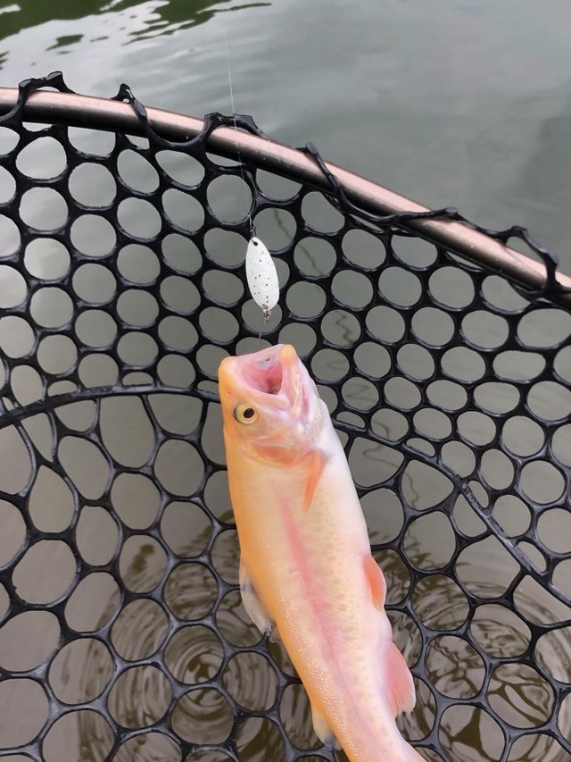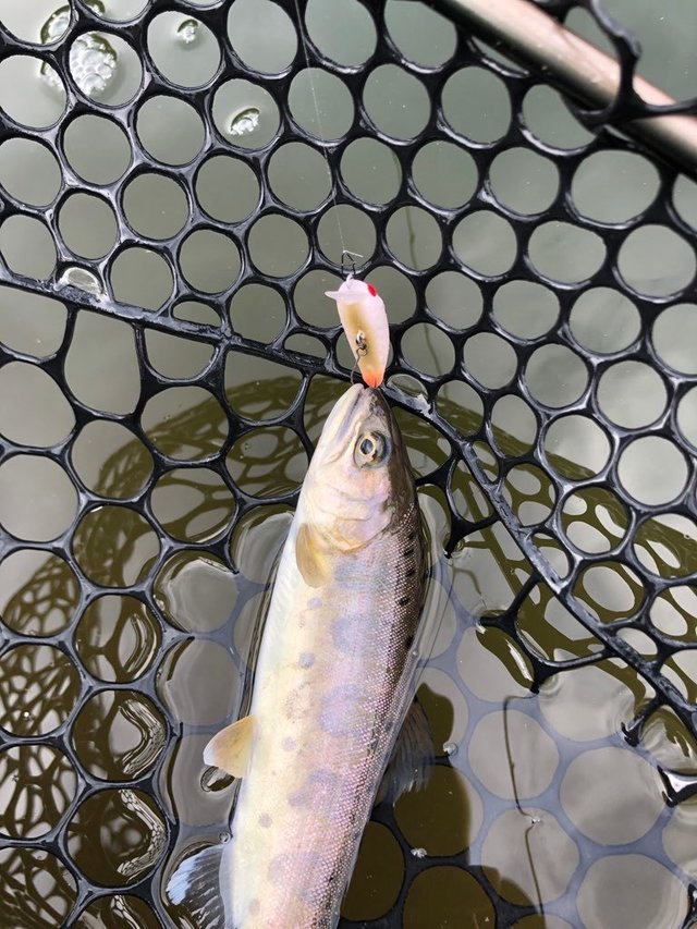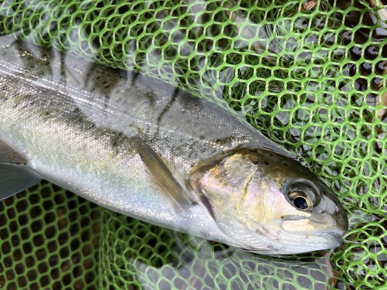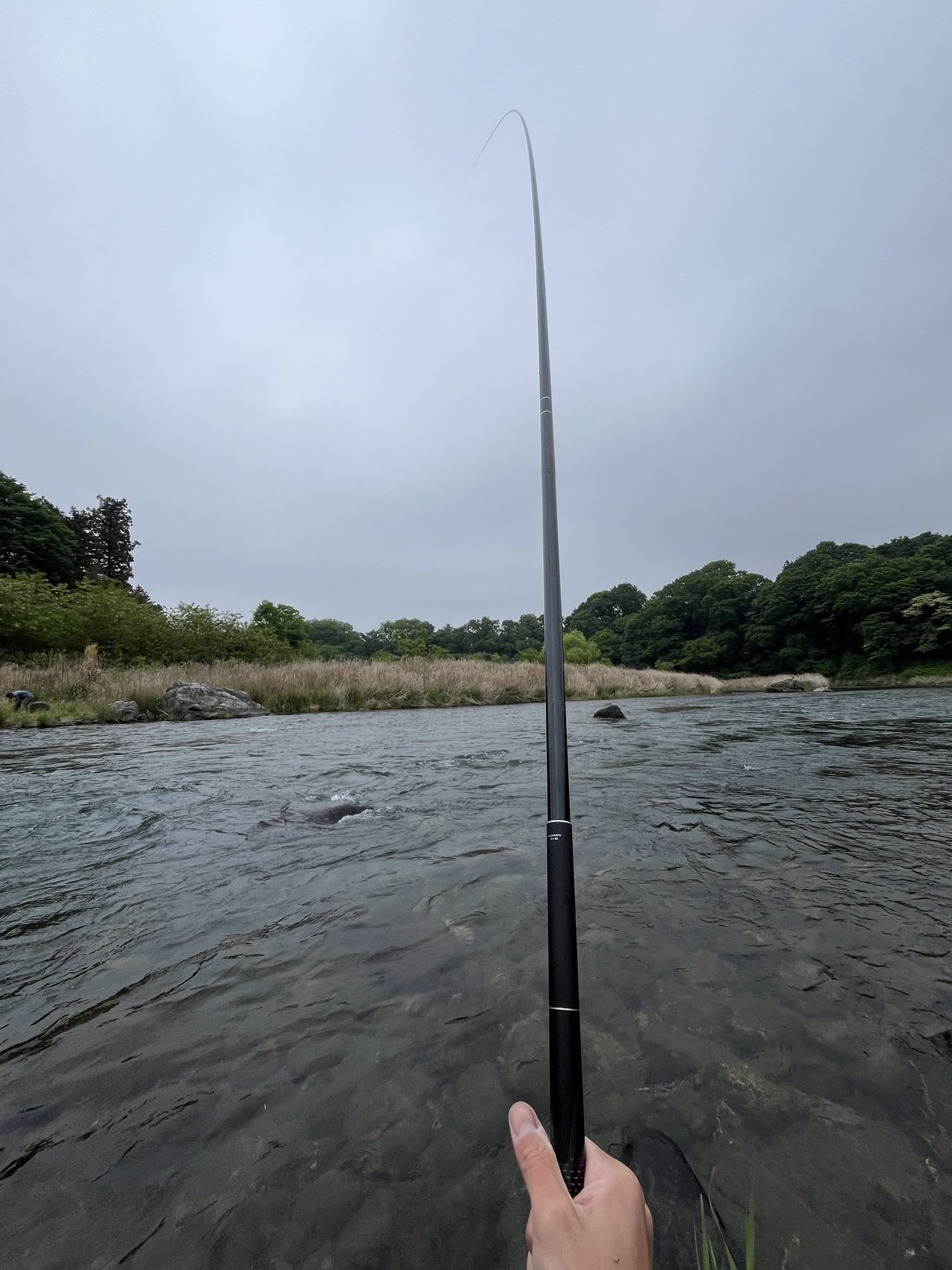 すると巻き始めすぐに飛沫をあげるほどド派手なバイトでマスがすっ飛んできてヒット!えっ?しかもデカいしめっちゃ引くんですけど?取りたい一心で慎重に寄せて無事ランディング。