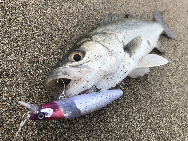風が強いものの波は高くなく、追い風の影響もあってキャストは気持ちイイ!バシバシ投げていくのですがなかなかどうしてアタリが無い。。。ワタナベ不調ですね(汗。ようやくアタリが出て釣り上がったのはシーバス君でしたが、とりあえずはヨシとします^^