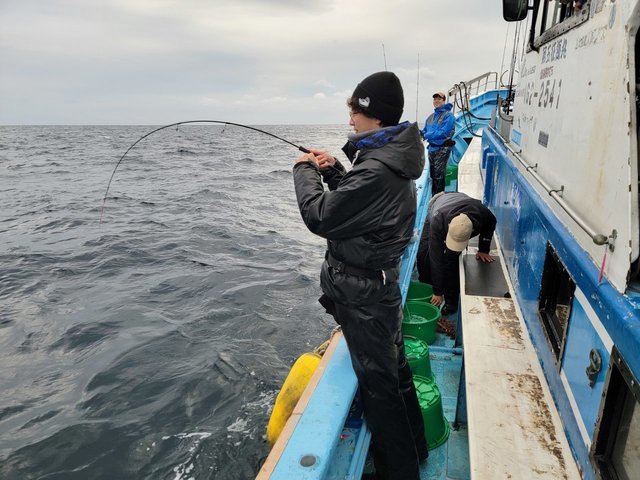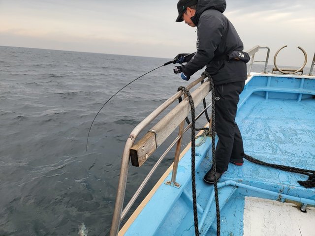 前回釣れた釣り方で挑もうと思い、実践するといきなりダブルヒット!!これはいい日に当たりましたねと同じ右舷にいた隣の柳井原さんと話しているそこから3時間ほどほとんどあたりがなくなります。左舷ばかりが釣れている状況でうらやましいと思いながらしばらく悶絶タイムが続きます。しかし潮が変わり急に右舷だけばたばた釣れ始め、連続ヒット!最後は満足感に満たされながらに納竿になりました。