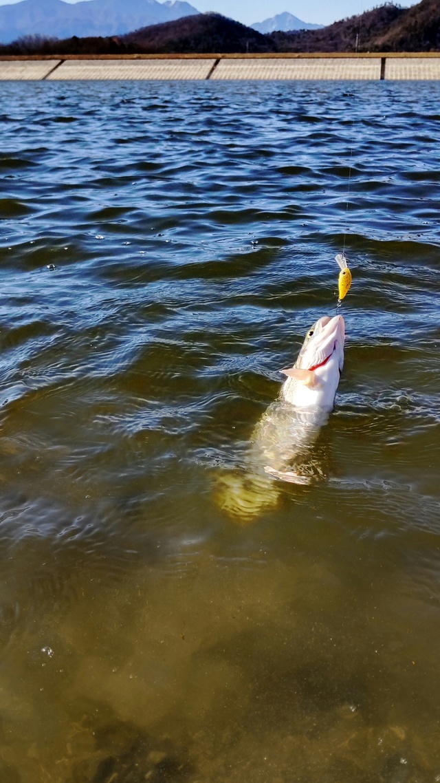 水温は11.5℃まで下がり、明暗にシーバスの気配は無く厳しそうな状況。橋下暗部のシャローにイナッコが溜まっていたのでそこでターンするようにウィリップを流してみるとヒット!貴重な1本を獲ることができました!