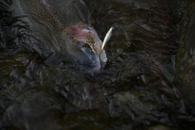 その後は山側水車前の日向に移動し、足元にイワナが居着いていたのでバイブレーションをヘチに落とし探るとヒット。狙い通りにイワナが釣れました。