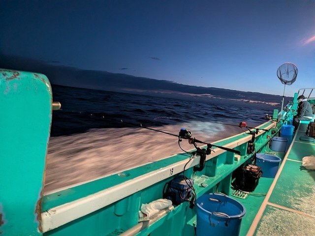 どうしてもヤリイカの釣り収めをしたい一心で船長に我がままを聞いていただき、越喜来湾へヤリイカ・タラジギングに行ってきました。明るいうちは底付近を中心にメタルジグでタラ狙いを行いましたが、私にはアタリは無く、同船したお客様には2本釣り上げた方がいらっしゃいました。日没とともにヤリイカ狙いにシフトしたものの、前情報通りにアタリは少なく、小型のヤリイカ1杯のみで終了となりました。今年は水温の変化が早く進み、ヤリイカ釣りも終了となるようです。日中のタラジギングは白子狙いでまだまだ釣果が期待できますので、次回はしっかりタラ狙いで釣行したいと思います。