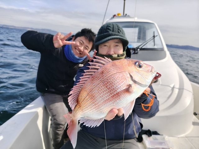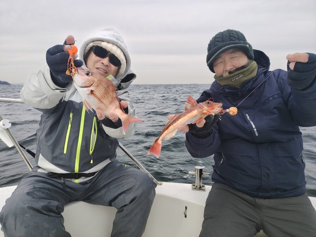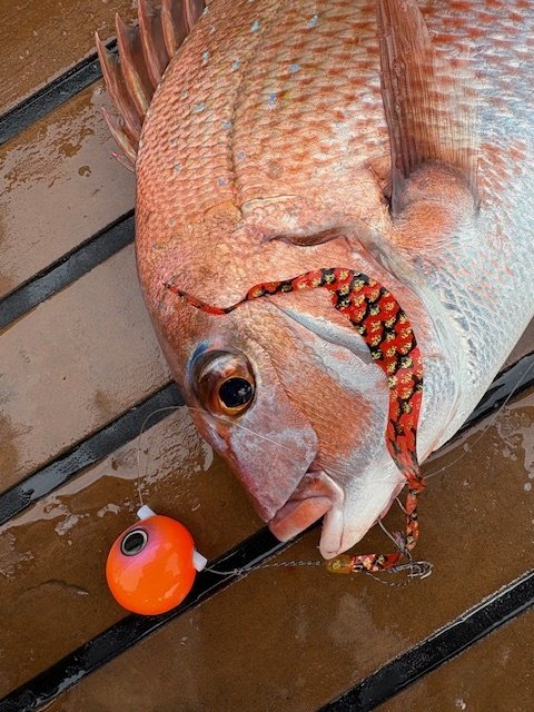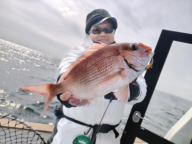 私は2枚のマダイを釣ることが出来ましたが、どちらも船長のアドバイスでスカートのカラーを変えた直後でした。状況に応じて的確にアドバイスしてくれた凄腕船長に釣らせてもらったマダイでした!