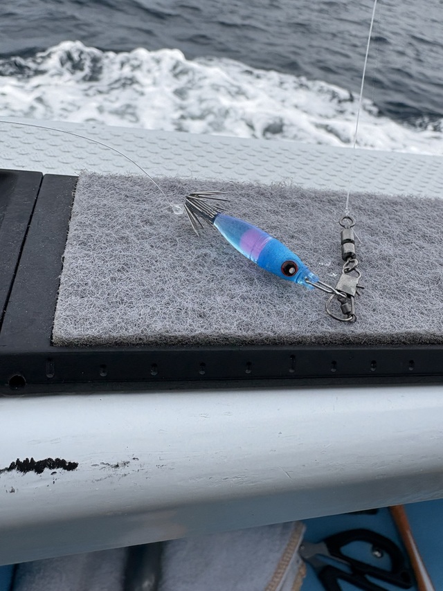 開始程なくして、ドラグを引き出される良いアタリからマダイと思われる強い引き。慎重にやり取りしましたが、大型船通過の際の引き波のウネリに対応できず、痛恨のフックアウト。