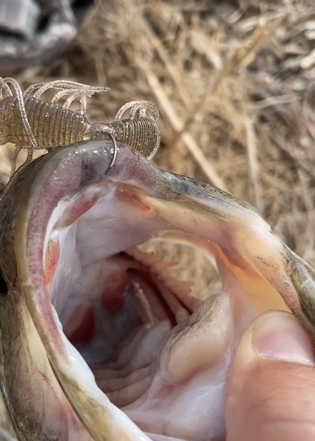 アシのヘコミのヨレを丁寧に打って、DSのシンカーが枯れたアシに少し引っ掛かり2WAYを表層で6回ほどシェイクすると、、、