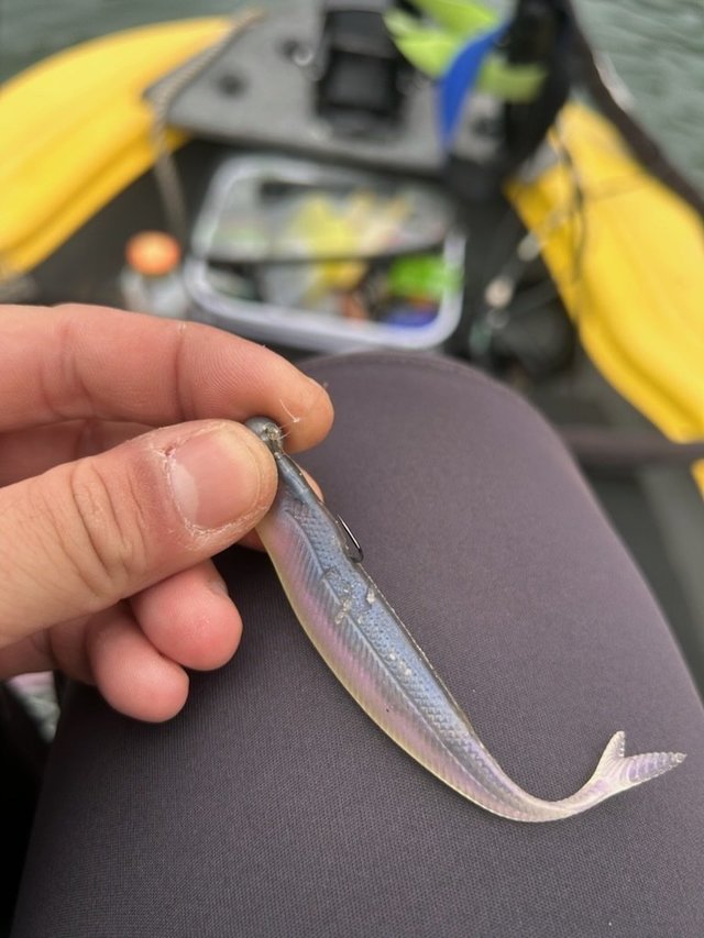1gジグヘッドにイージーシェイカー2.5インチをセットしボトム付近を探るとアタリはありますが針掛かりせず。
