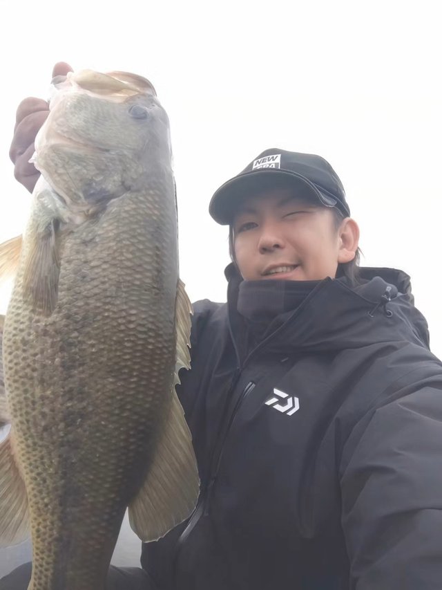 風の当たり方を見ながら車を走らせ、さしかかったドッグの壁沿いをミドストで丁寧に引いてくると、「ズンッ」と突然重くなるような感触が、、。強いうねりもあったので半信半疑で合わせてみると、、魚!!しかも中々の重量感!!バスである事を願って慎重なファイトの末に顔を出したのは48cmのナイスバス♪♪念願の2026年本湖初バスにしばらく放心状態でした(笑)