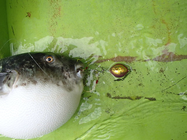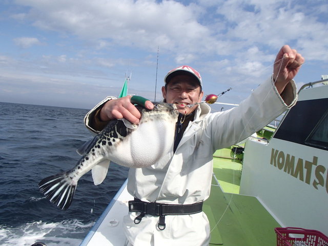 こんにちは船担当の佐藤です、今回はXデー間近のトラフグ釣りに行ってきました。船宿は忠彦丸さんです。少ない人数で仕立ててもらいありがとうございます。先週あたりから乗っ込み場所で釣れ始めたとの事で、ポイントは富浦沖金沢漁港から1時間ほど走ります。ポイントに到着すると30隻近くの船が集結していました。水深は80mオモリ40号でスタート!まず最初に釣れたのがウッカリカサゴ、イワシ餌に食いついてきました、そして2匹目も良型のアマダイ37cmこれは嬉しい外道で五目釣りの様相になってきました(汗)