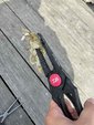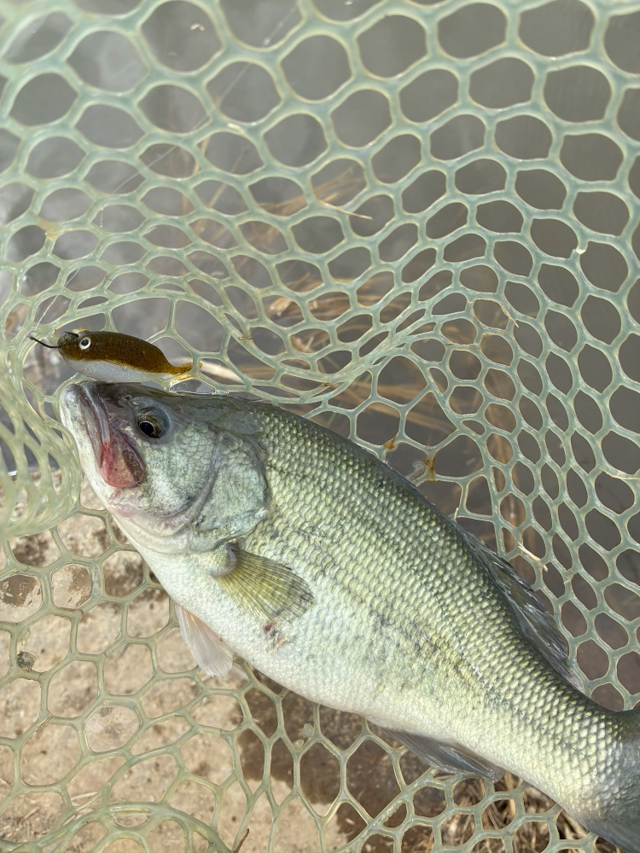 岩ノ上橋の下の沈みモノがあったのを思い出し魚探で確認、ヴァラップスイマーの7gフットボールヘッドでオダを追い越すと近辺にバスっぽい影が映ったので魚を追いこしてボトムに着底すると・・・「んん?重い?」と思って聞くと生命反応を感じたのでフッキング!上がってきた魚をネットで掬って思わず叫んでしまいました笑