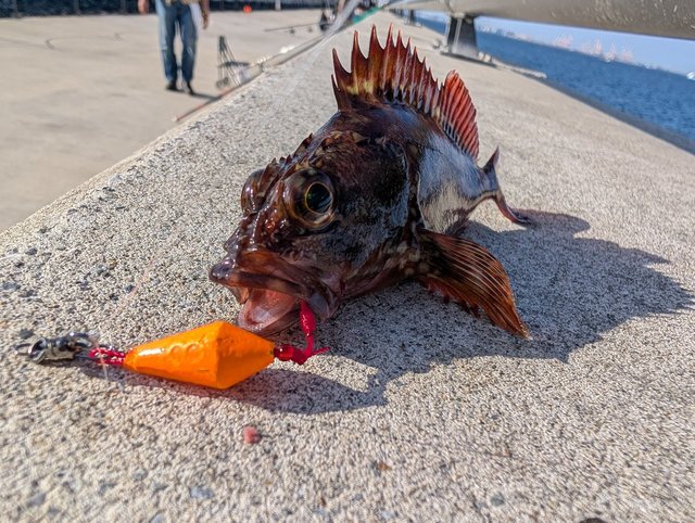 メタルジグにワームをセットすると、早々に良型メバルをキャッチ。その後もタイラバ・スイッチ・メタルジグと手を変え品を変えて探っていきましたが、カナガシラを1匹追加して終了となりました。