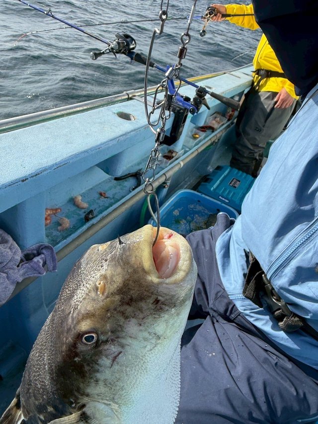 それでも船中ポツポツと50から60cmサイズがちらほら上がり始め、時合いを掴んだ石橋さんが50cmオーバーの真鯛をまずは1枚!わたしは良型のアオナ😇