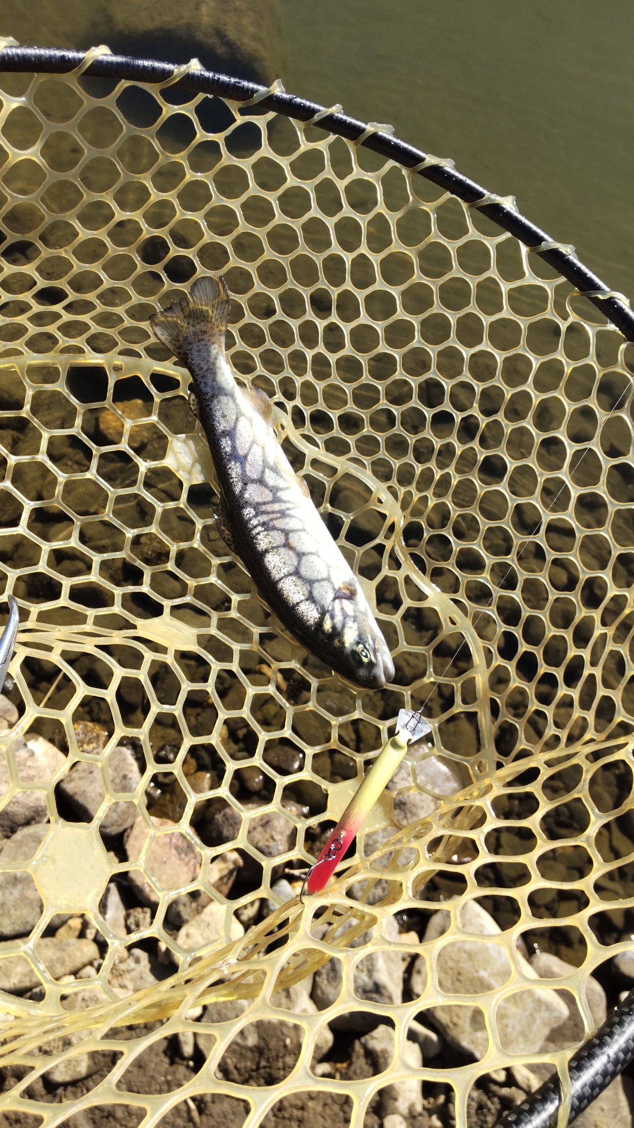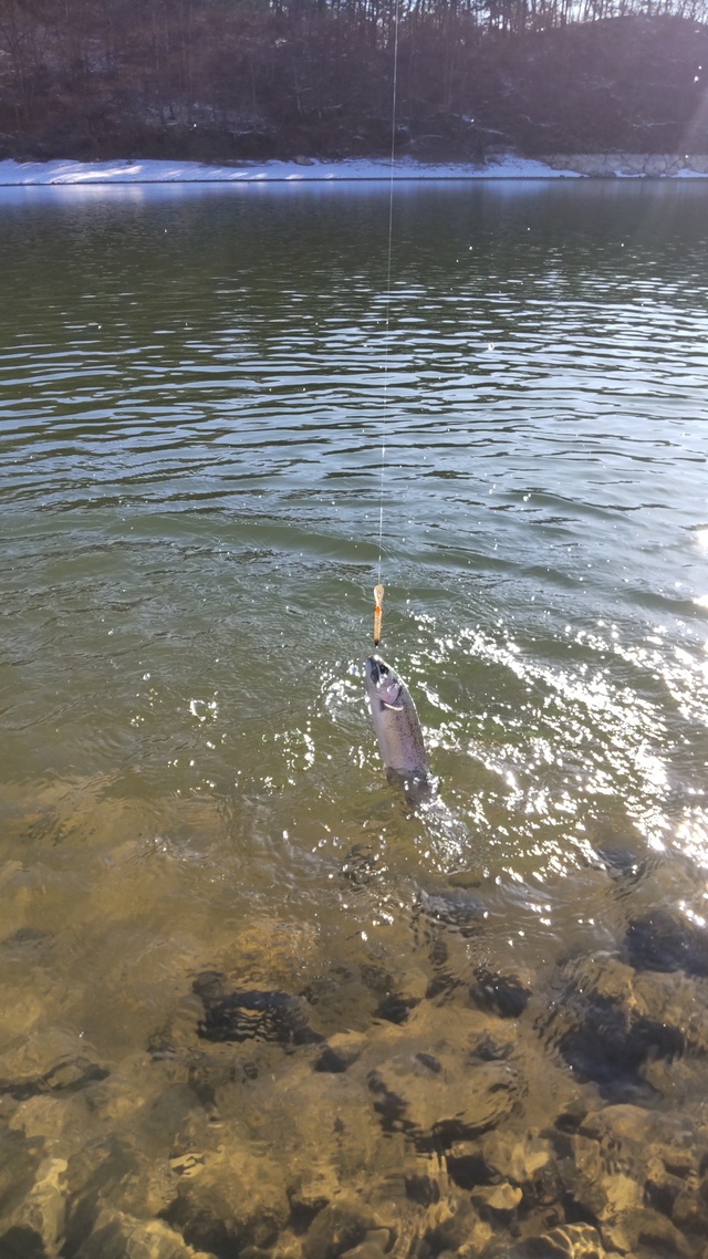 上流の浅い水の動き無い所、凍ってたので、ノーチャンスかと思ってましたが、奇跡的に釣れました。