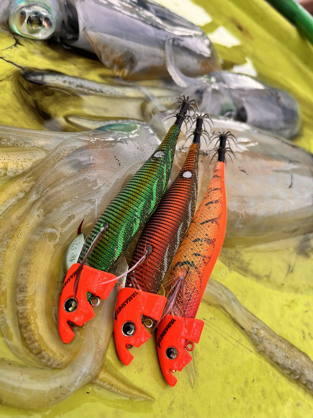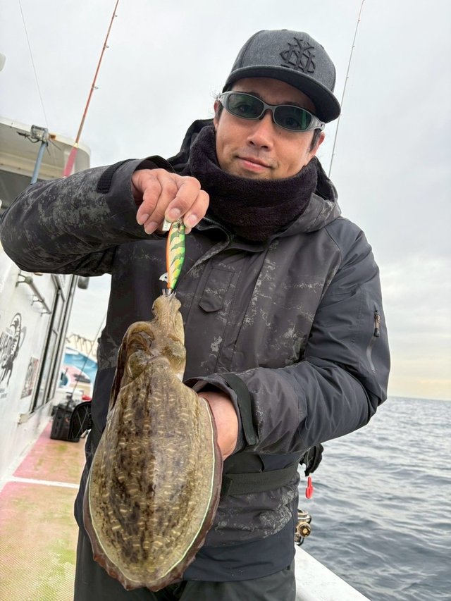 この日は只今、船に積んである12月発売予定のクロノ製エギ「ケストレル」を少しお借りしました。使用感としては「動きのキレ」「姿勢が出来上がるまでの速度」「静止安定性」などティップランに必要な要素をしっかり満たしており、ファットで奇抜な見た目にそぐわぬ優等生君といった印象。追加シンカーはヤマシタとマルキューの物が違和感なく装着出来ます。カラーも釣れそうな物ばかりで、発売が楽しみです。