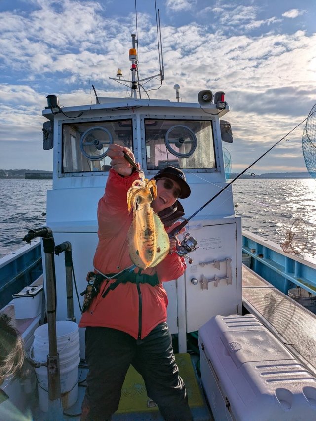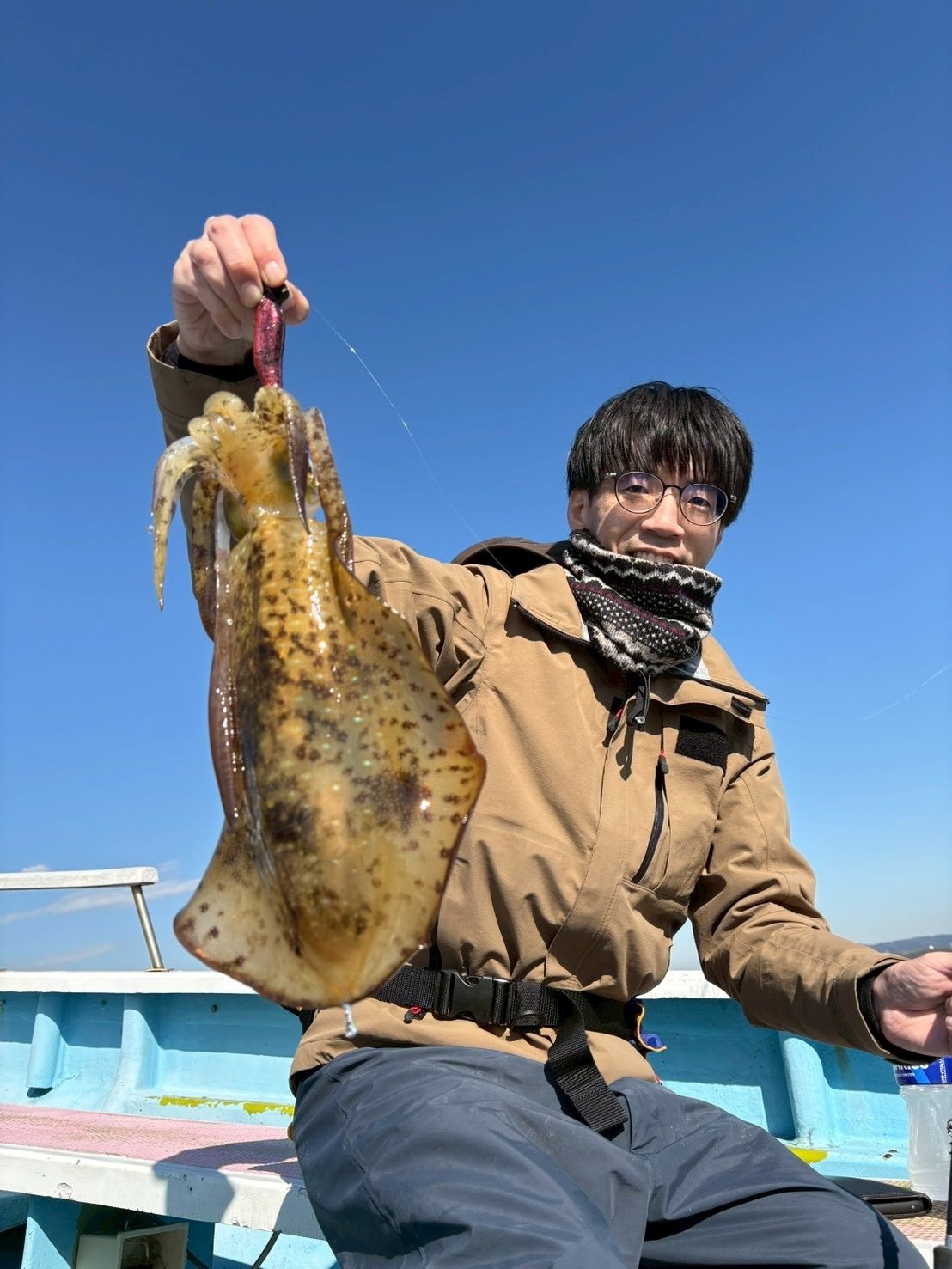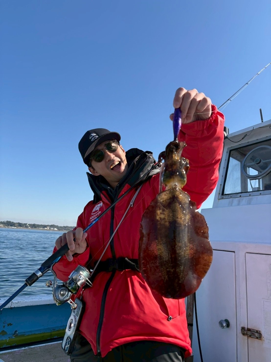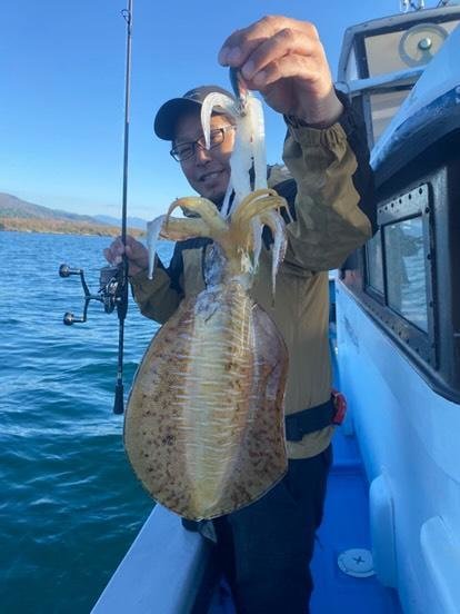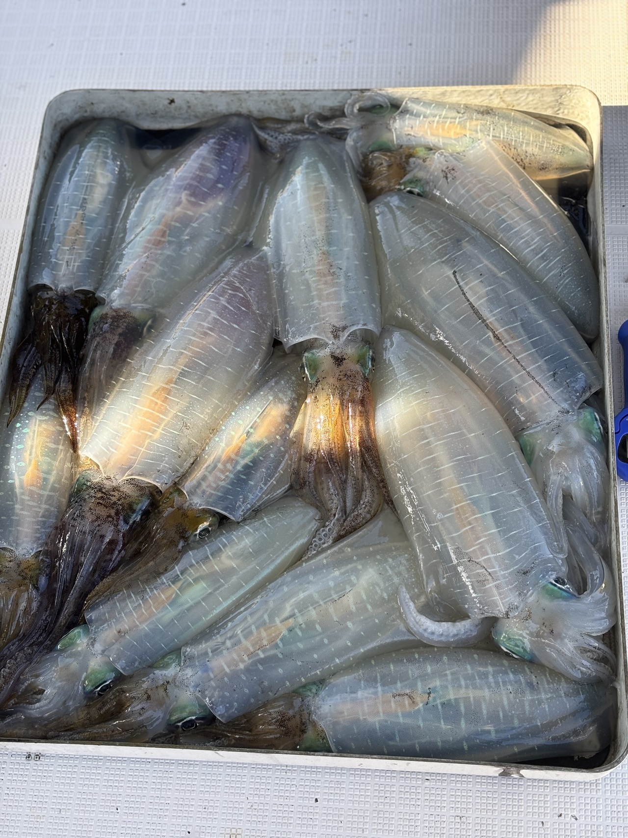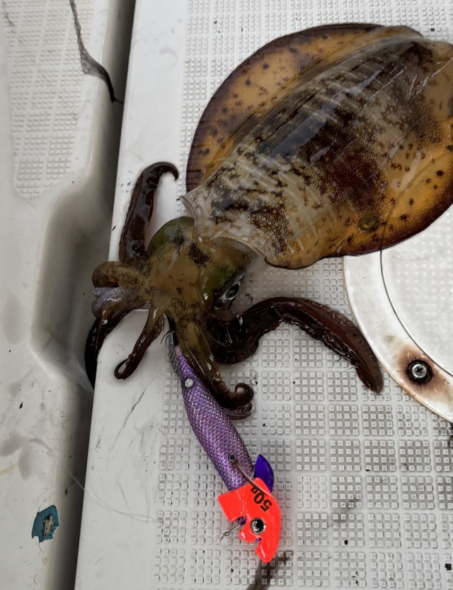 出船からなかなか厳しいスタートでしたが、ポイントを回りながらしっかりとイカが上がります。サバフグやエソが掛かるタイミングも多く、「掛かったー!」、「エソでしょ!!」からの本命なんて場面もあり、仕立て船なので皆で楽しく釣りができました。モンゴウイカも多く、墨爆弾で皆大はしゃぎしてました(笑)