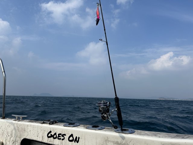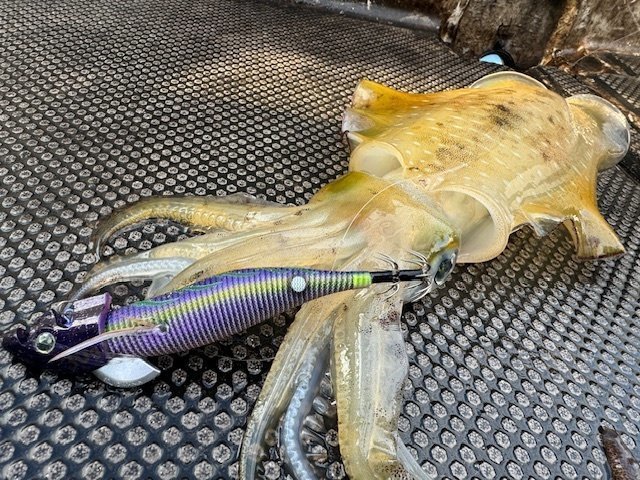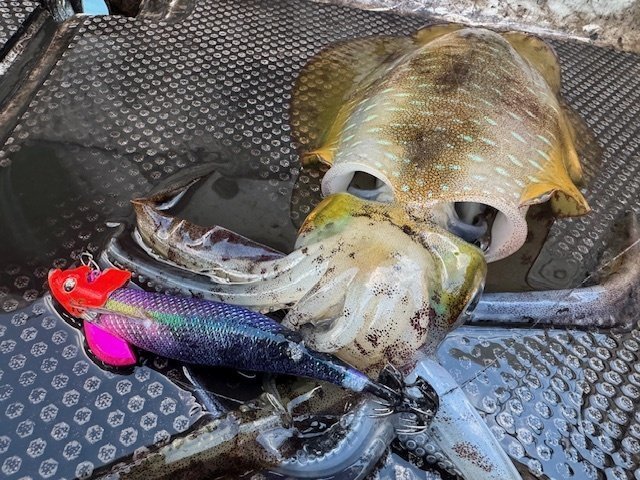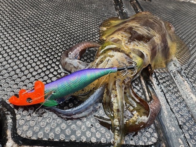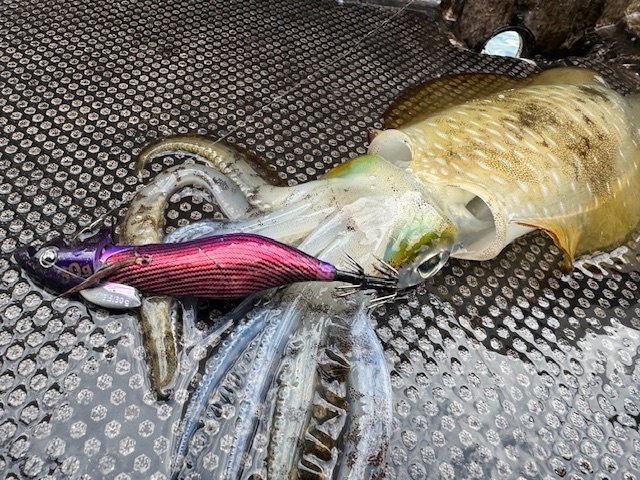 初めてのティップランに挑戦しました。アオリイカを狙うのも20年振りくらいです。一応予習はしていきましたが、普段の釣りと違い過ぎてコツをつかむのに時間が掛かりなんとか2ハイ。水深は20~30mくらいでしたが、北西風が強かったためシンカーを追加して60~70gにしていました。明確なアタリを何回も掛け損ねたりもしてしまいました。また釣行してみます。