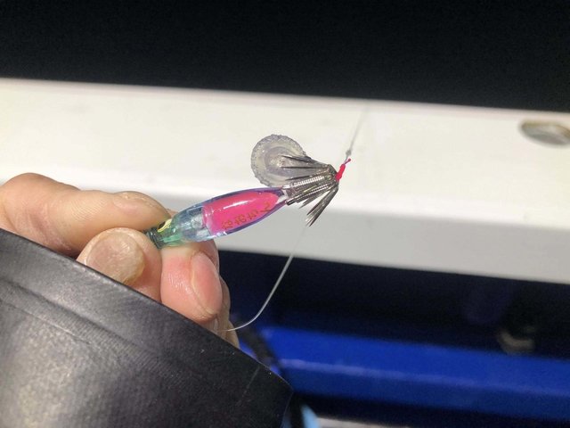 満船でイカの配当が低いだろうと思いシルエットがはっきり出る赤テープをメインに使い3杯GET!(TOPは10杯以上釣ってました)