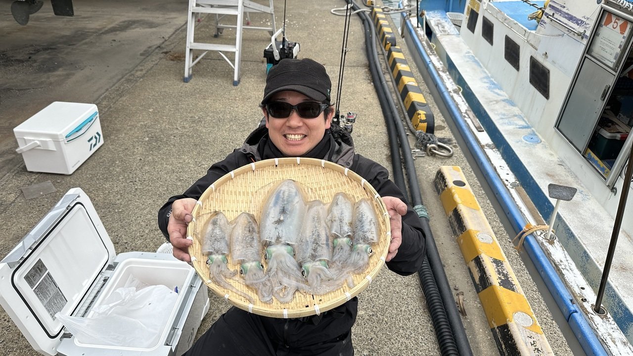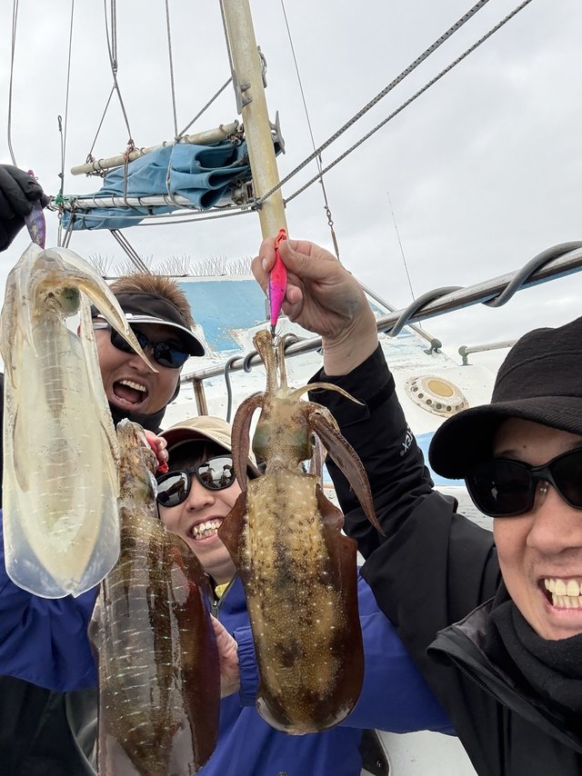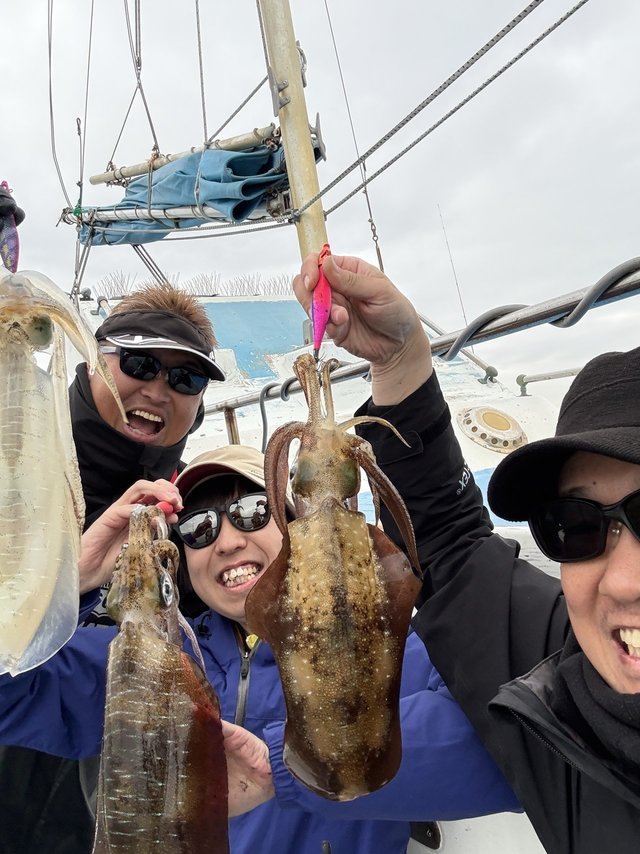 お二人にレクチャーを受けながら底どりからシャクリ方、ピッチなど様々なテクニックを教えていただきいざ実践!しかし、ぜんぜんつれない。今期はよく釣れてるし1杯くらいは初心者の自分でも釣れるだろうと甘い考えでおりましたが全く甘くないティップラン。その後も黙々とシャクリ続け帰着アナウンスからの2流し目で待望のヒット!釣れちゃった感が強かったですが価値ある1杯でした!