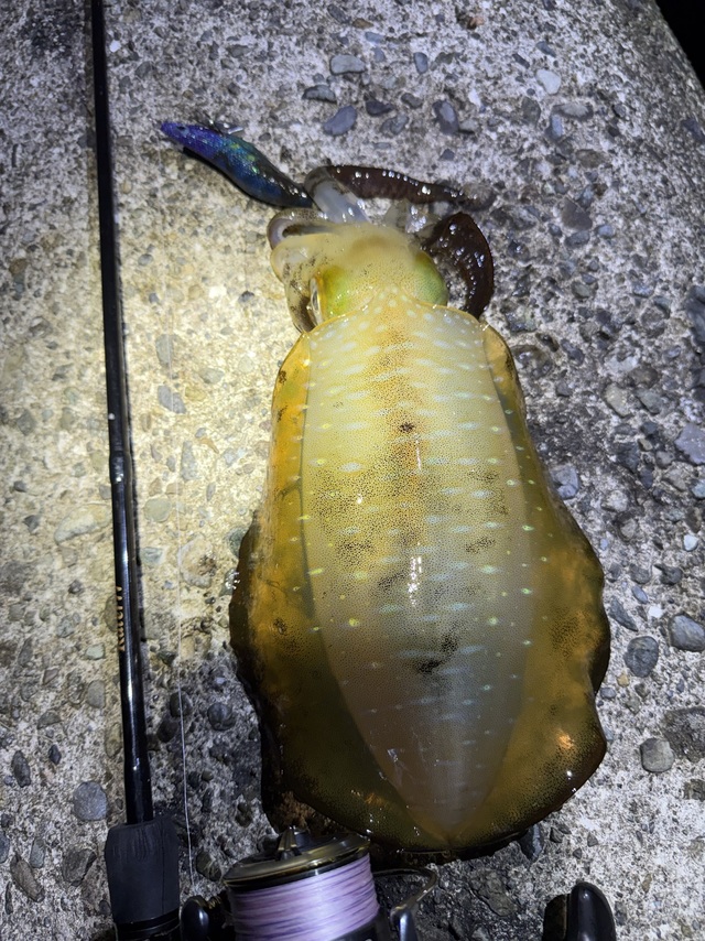 エギ王Kの3号をキャストしボトム付近をゆっくり丁寧に探ってると軽くお触りの後に抱いてくれましたー^_^