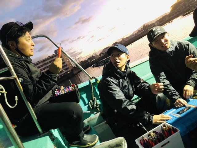 午前便からの午後便!港に戻って少し休憩を挟み出船!メンバーも変わりイカ好きなお客様たち。午前便で慣れていたのか早々に2杯掛けるもペースダウン。横でイカオジサン達が本領発揮してきます!やはりプレッシャーが薄くなるのか日没頃にバタバタと掛かります。ジーーーッというドラグ音は気持ちいいですね!初ナイトはワクワク。完全暗くなってからは誘い方が一気に変わり苦戦。新子の3cm位のアオリも沢山浮いてきて、集まった小魚を捕食する姿は感動しました。ヤリイカ釣りの誘いが一番効いた気がします。ナイトは攻略次第で釣果が伸ばせそうです。タイミングが合えば再挑戦します!