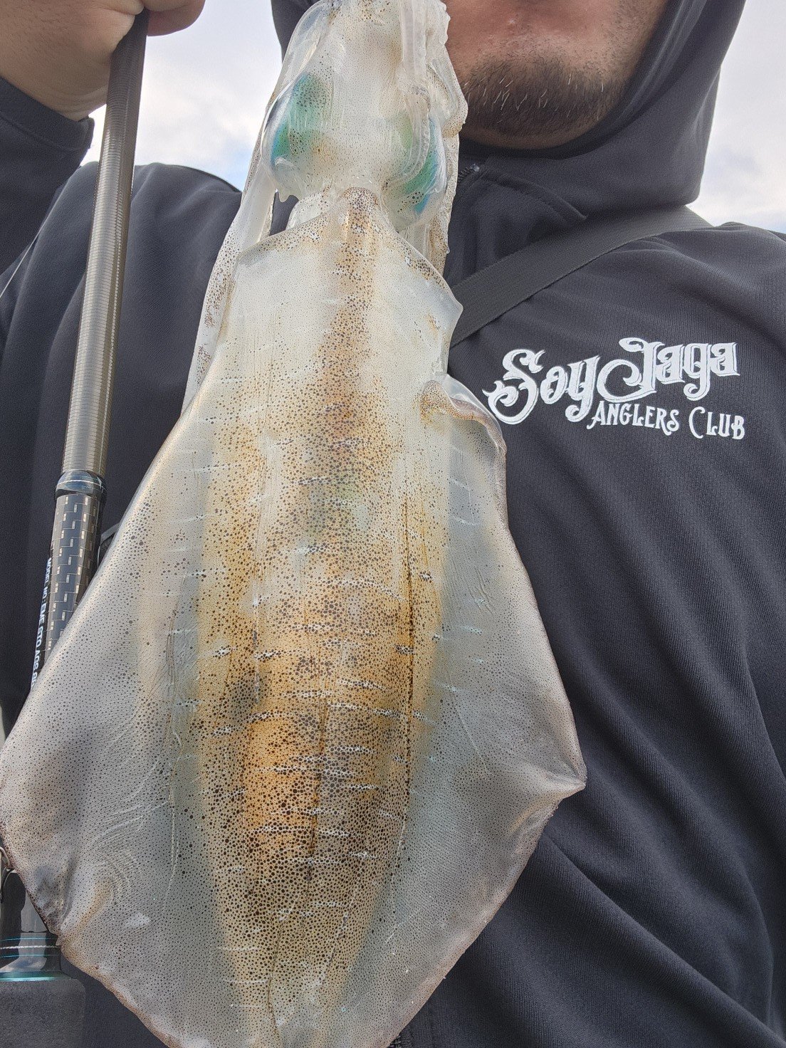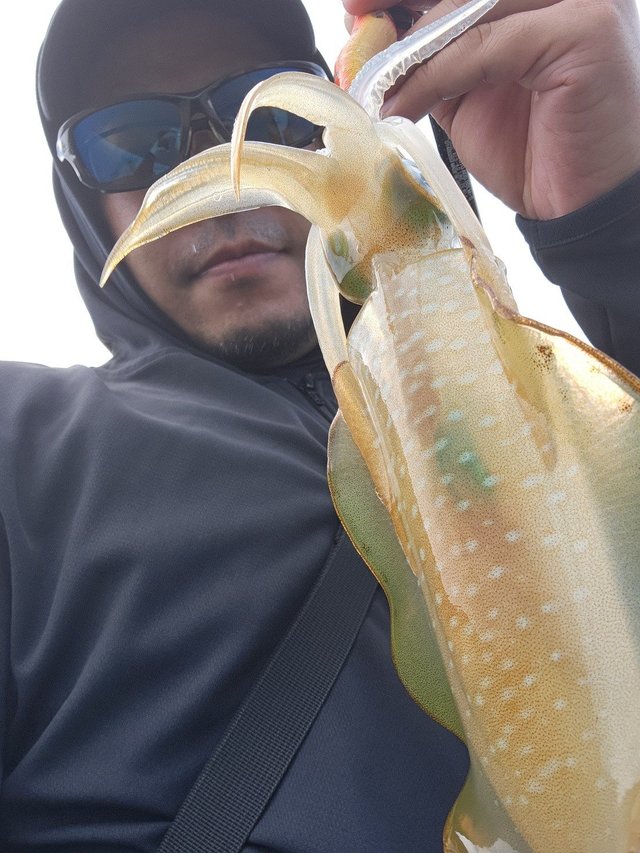 開始一時間無の状況から今回初イカメタルのスタッフ斎藤が口火を切る1杯を釣り上げた時は船内歓喜の祝福と拍手喝采が沸き上がり、ここから怒涛の連掛けか?と思ったがそうは問屋が卸さず・・・。