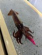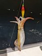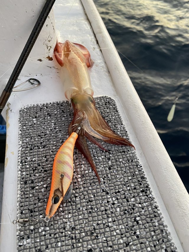 開始2時間程でようやくサバが少なくなり、狙いの水深で誘ってみると穂先が跳ね上がるアタリ!これはイカじゃないか!!サバのように暴れないぞ!?残り数メートルで荒々しい引きに。どっちだ?どっちなんだ?あげてみるとドロッパーにサバの姿が。「あぁ、、、イカじゃないのか」とガッカリしているとメタルスッテに茶色っぽい何かがついています。「イカじゃん!!!」サバも一緒ですが無事にイカ釣れました!