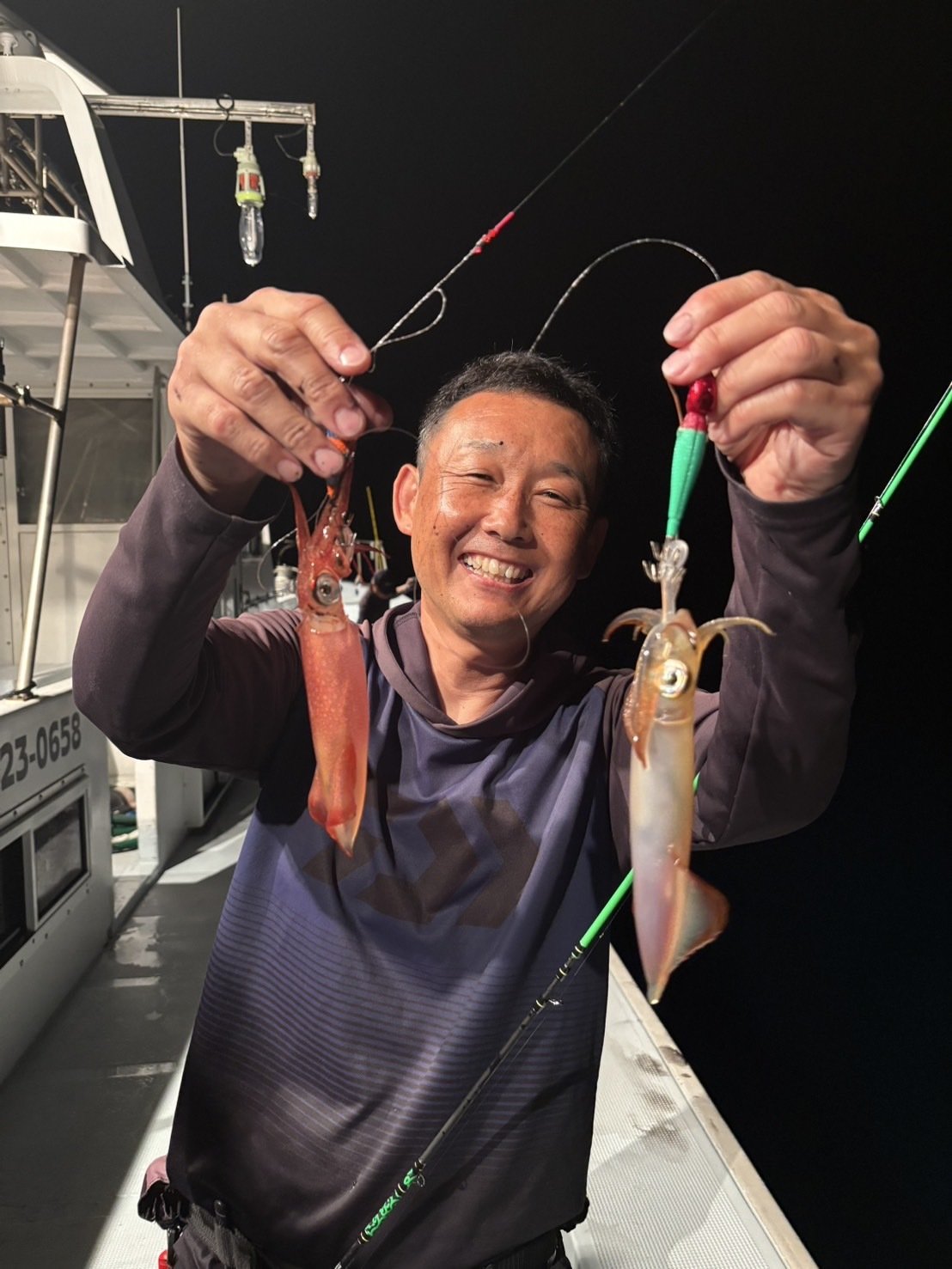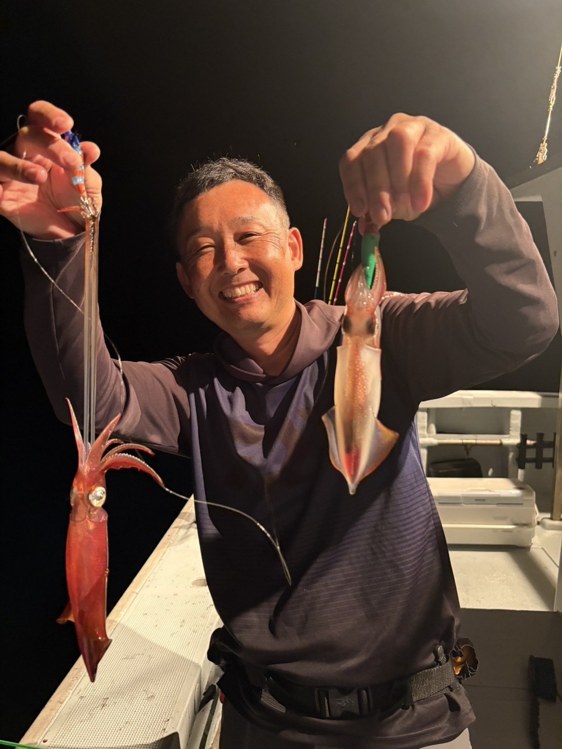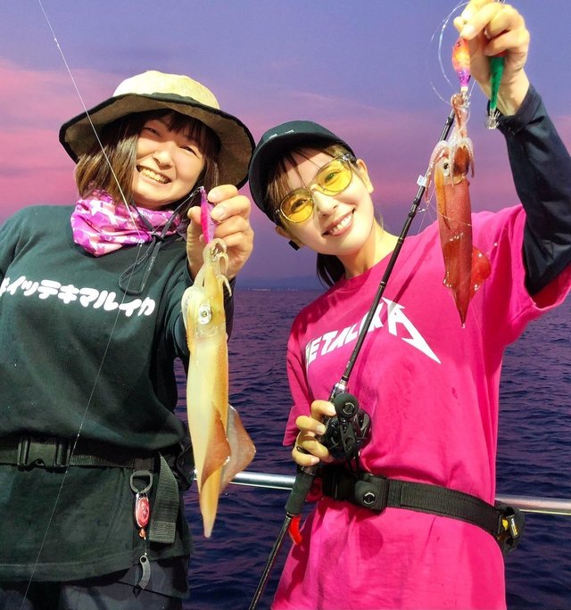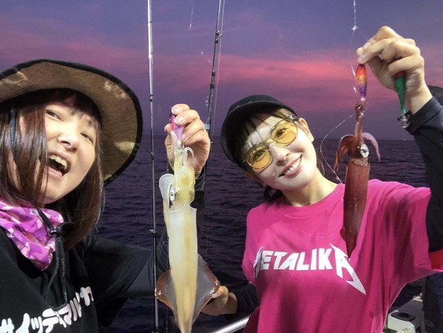 ポイント移動後はやはり15メートルより上でよく当たってくるので軽めのメタルスッテで誘います。途中大剣サイズの群れが水面を行ったり来たりしているのでかなり浮いていると判断。ボックスに忍ばせておいた2.5号のエギをちょい投げで5メートル付近をライトエギングで攻めるとポンッポンッと3杯ゲット。その後はメタルスッテに戻し15メートル付近で小さなアタリを掛けていくテクニカルな展開で雲船長とワイワイ釣りながら2日目は17杯で終了。数は前日みたいにいかなかったですが誘って掛ける釣りで楽しめました。