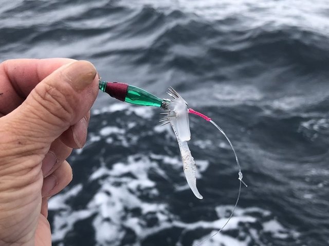 ウネリで船が上下する状況で、アタリがわかりにくいし、イカがなかなか乗ってこない。