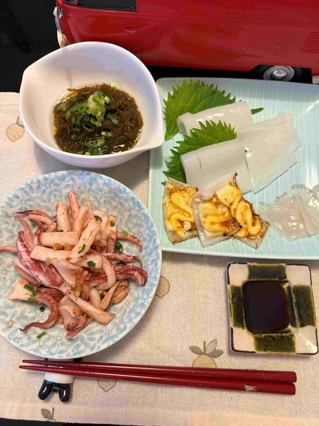 7月に入り爆釣続きの玄海灘夜ダキイカメタルゲーム!釣れている時に行っとかな!てなわけで行って来ました。もちろん爆&釣!そこで今回は釣ったケンサキイカを美味しく頂く為のオススメレシピ紹介!画像1枚目【韓国風イカユッケ】イカを少し分厚くカットしたお造りに醤油とゴマ油を合わせた調味料をぶっかけ玉子の黄身と海苔&ゴマをふりかけて出来上がり!画像2枚目【炙りイカのにぎり】同長15cm程のイカがベスト!身が薄く柔らかいので旨し!1杯で2貫分が出来ます。握った後に軽くイカの表面を炙ると香ばしくなり更に旨し!飾り包丁を入れると見た目も旨し!画像3枚目【イカ飯】キングオブイカ料理!もち米と生米を5:5の割合にイカゲソを刻んで胴に詰め込む*詰め込み過ぎ注意。醤油、みりん、酒、砂糖とショウガを入れた煮汁で煮つける事40分!熱々のイカ飯は絶品です!イカはいろんな調理方法があるので試してみて下さい!