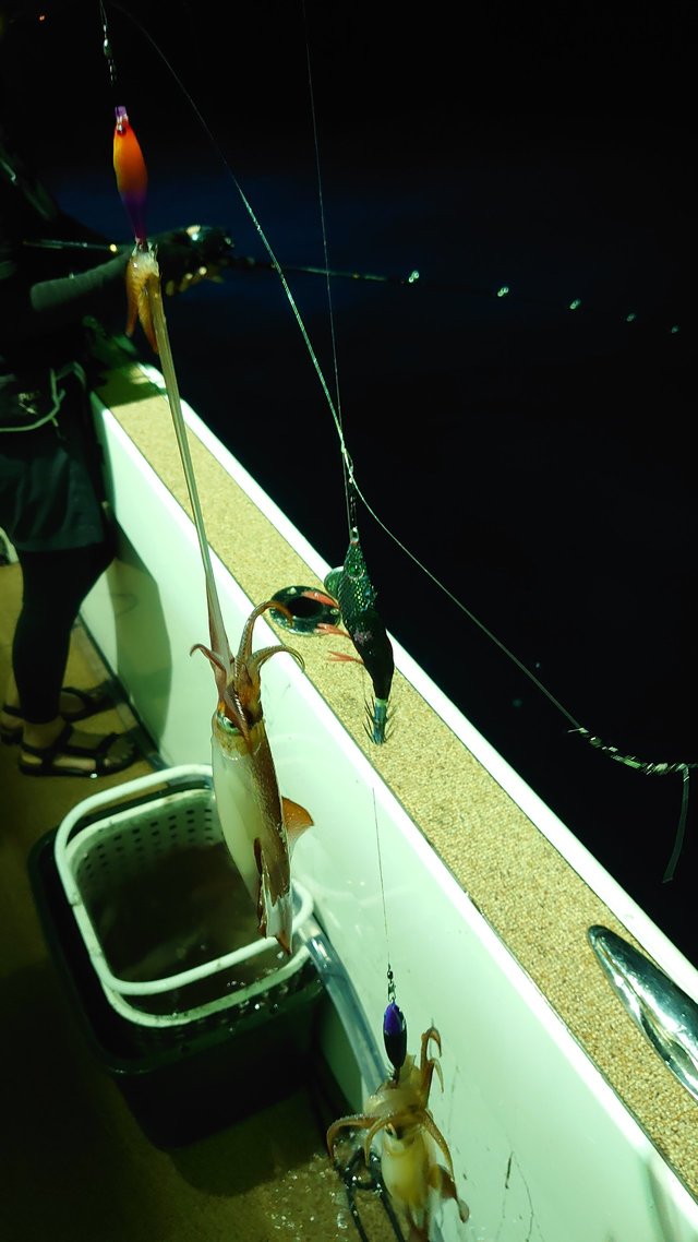 明るい間はオモリグでボトム付近をネチネチ探りながらカウントでしたが、集魚灯が効き始めると状況は一変。表層からボトムまで、イカでびっしりでした。