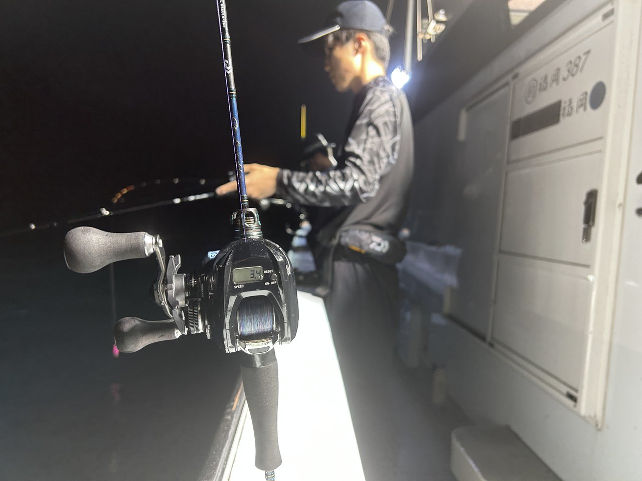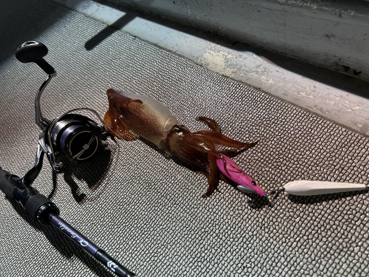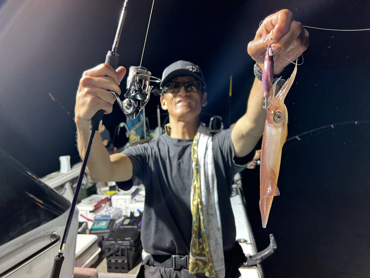 しかし、本番は夜焚きが始まってからですよ!30号のメタルに浮きスッテを2本セットしたお馴染み仕掛けで誘っていくとようやくヒット!ボトム付近で1ハイ釣れて一安心。この日の当たりカラーはピンク・ムラサキ・白グローなどがよかったですね^^
