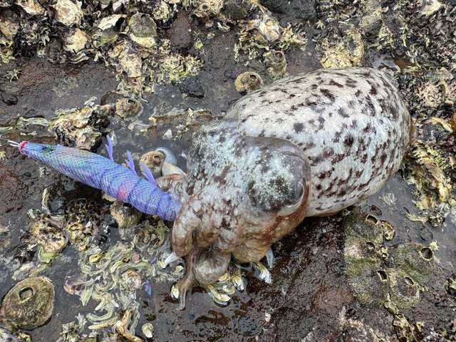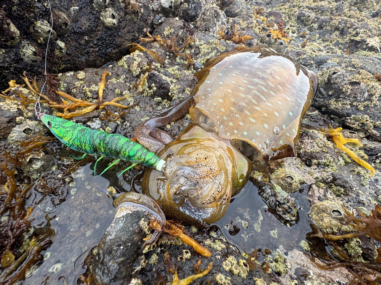 友達はヒラスズキを諦め磯付け根でエギングをして2キロのアオリイカをゲット!!