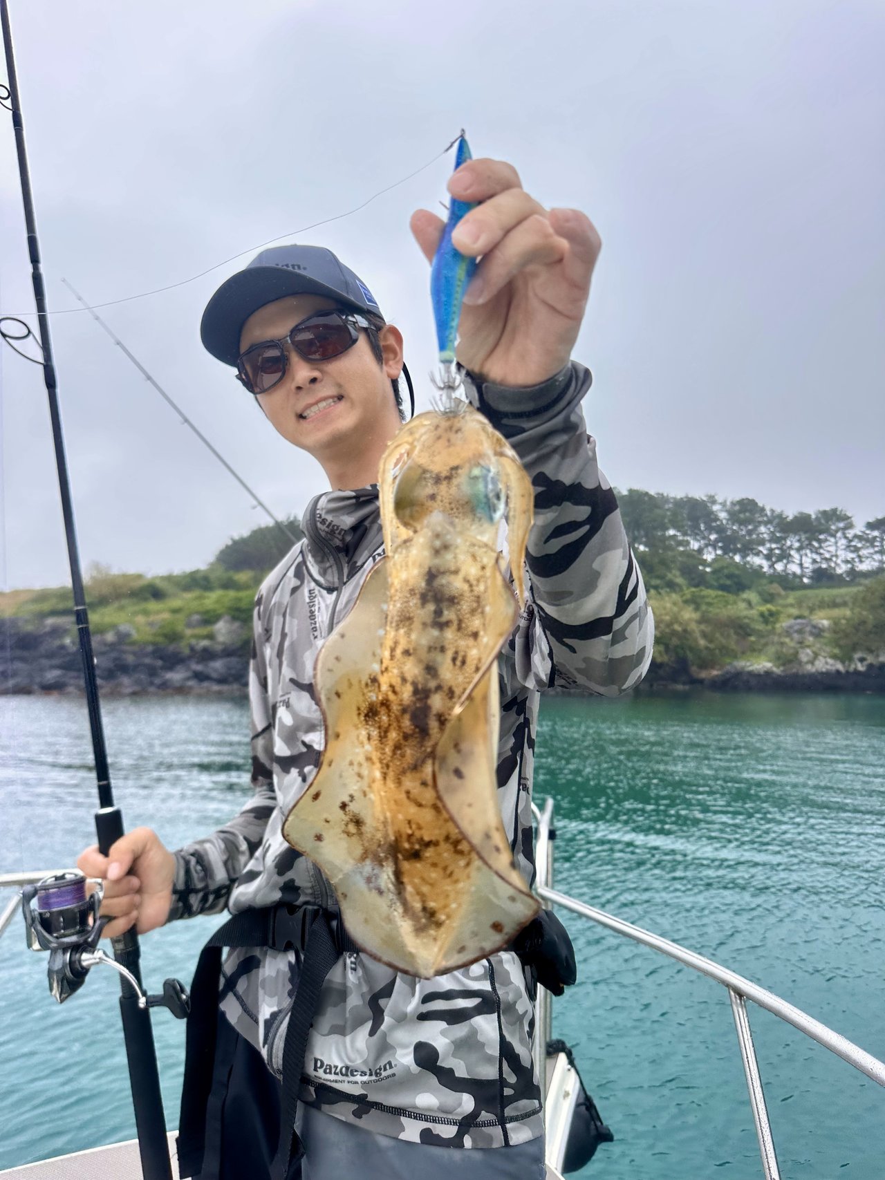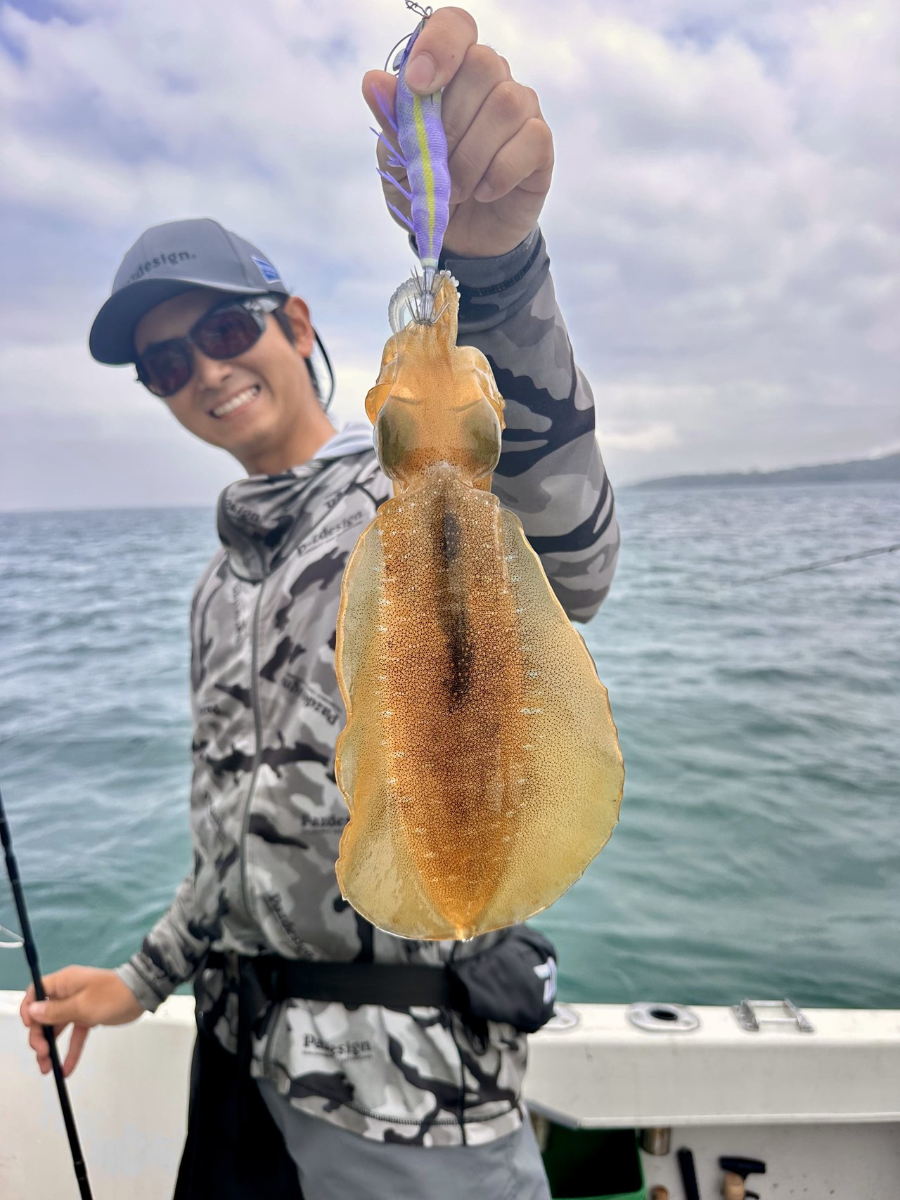 当日は曇天&凪~と絶好のイカ日和でしたが、ポイント周辺には鳥山が多くハモノが回っているようでイカ様の活性は今一つ。1時間半ほどして何とかムギイカとご対面。