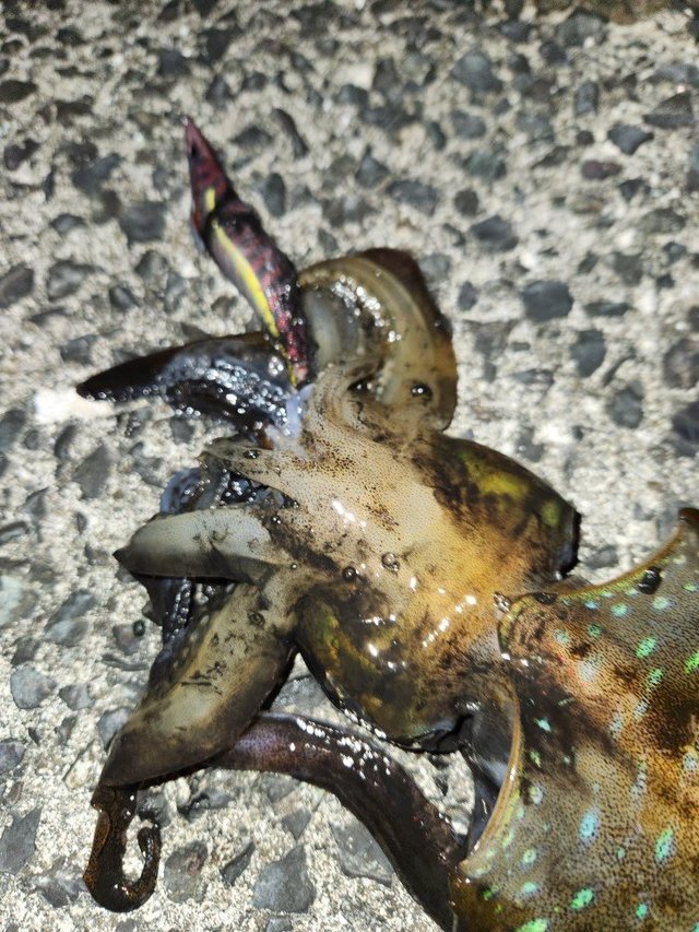 なかなか上がってこず苦戦します。これ2キロあんじゃない?としゃべりながら上がってきてタモ入れ完了。釣れてきたアオリは900g程だったのですが、私が直前にロストしたエギに夫が使用していたエギがおまつりした状態だったのでなかなか上がってこなかったようでした。バレず上がってよかったです。