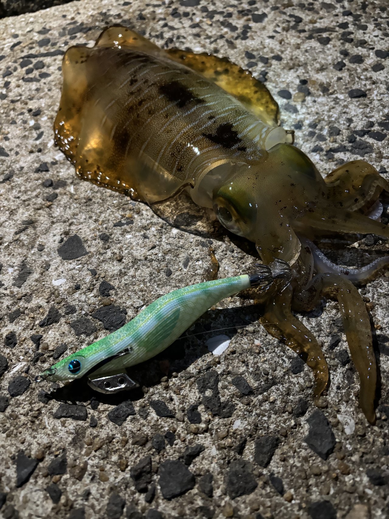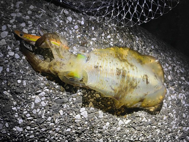 最初、エギングで2回ほどイカパンチをくらいフッキングまで持ち込んだのですがすぐにバレてしまいました。