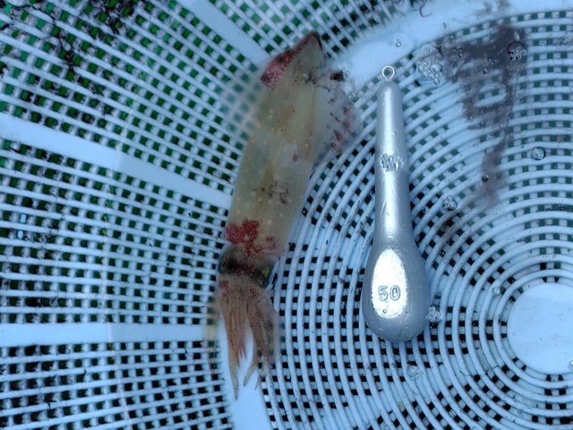 最初のポイントではすでに先行者の方が釣っており、イカ墨の後もちらほらと。下げのタイミングでしたが、1時間程で1杯ゲット!