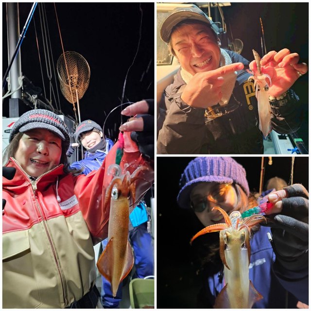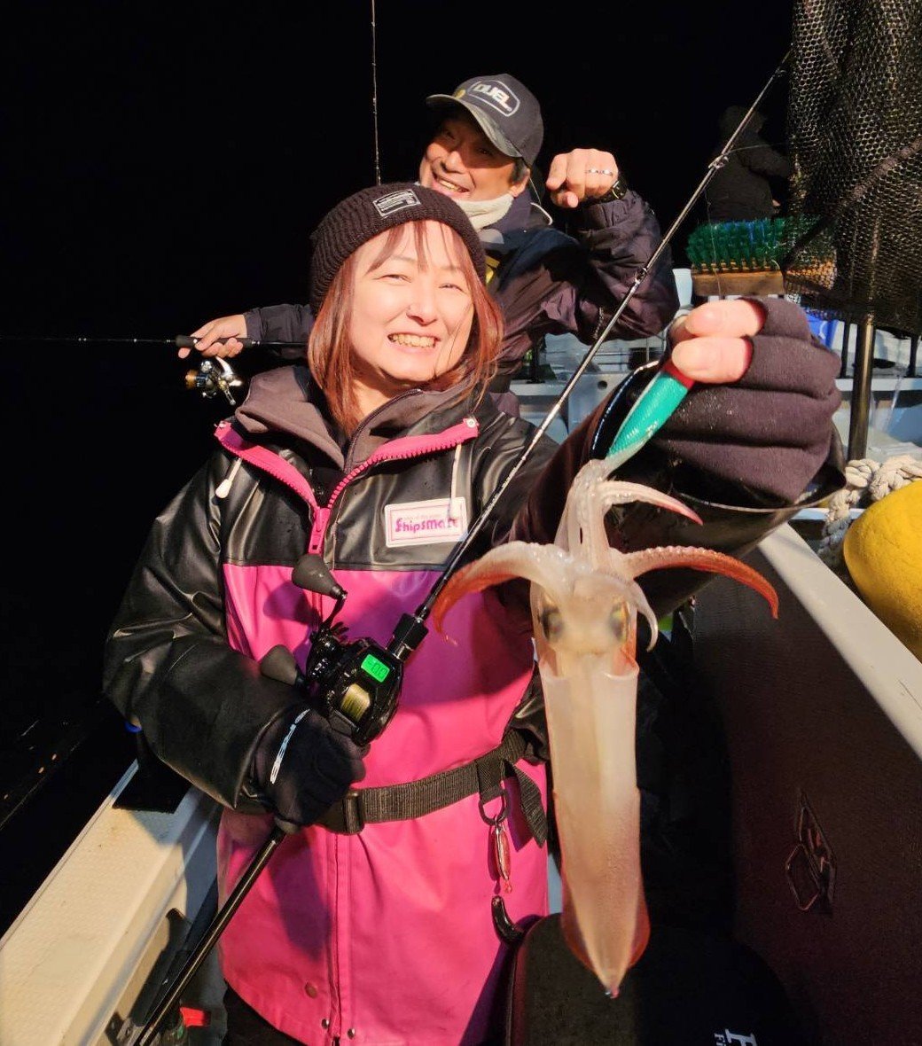 こんにちは(´▽`*)岩槻インター店スタッフ稲垣です。前回初めてイカメタルを体験してからすっかりハマってしまい、今回も沼津へイカメタルに行ってきました。朝霞店スタッフ黒葛原さんと友人Tさんに加えDUELの武田さんと池内先生とご一緒させて頂き皆で夜遊びです。今回の船宿さんは静浦港の光進丸さん。15:30頃出船しのんびり時合を待ちます。しかし思いのほか波が高く船の揺れが大きく乗り物に弱い私はアネロンを飲んでいるのに釣りを始める前からグロッキー…。皆でワイワイ準備している場所から離れた所でひたすら遠くを見つめ船の揺れ耐えていました(-_-;)仕掛けの準備は黒葛原さんが手伝ってくれて準備をし釣りを始めると段々と元気になってきました(笑)いよいよ日も落ち船のライトが灯されると穂先のアタリに全集中。僅かなアタリを捉え釣り上げる快感がクセになります(*´艸`)序盤にパタパタっと釣れて期待度が上がりましたが、そう甘くなく最終的な釣果は6匹でした。しかし、やればやるほど面白さが増していくイカメタル、またすぐに行きたいです。