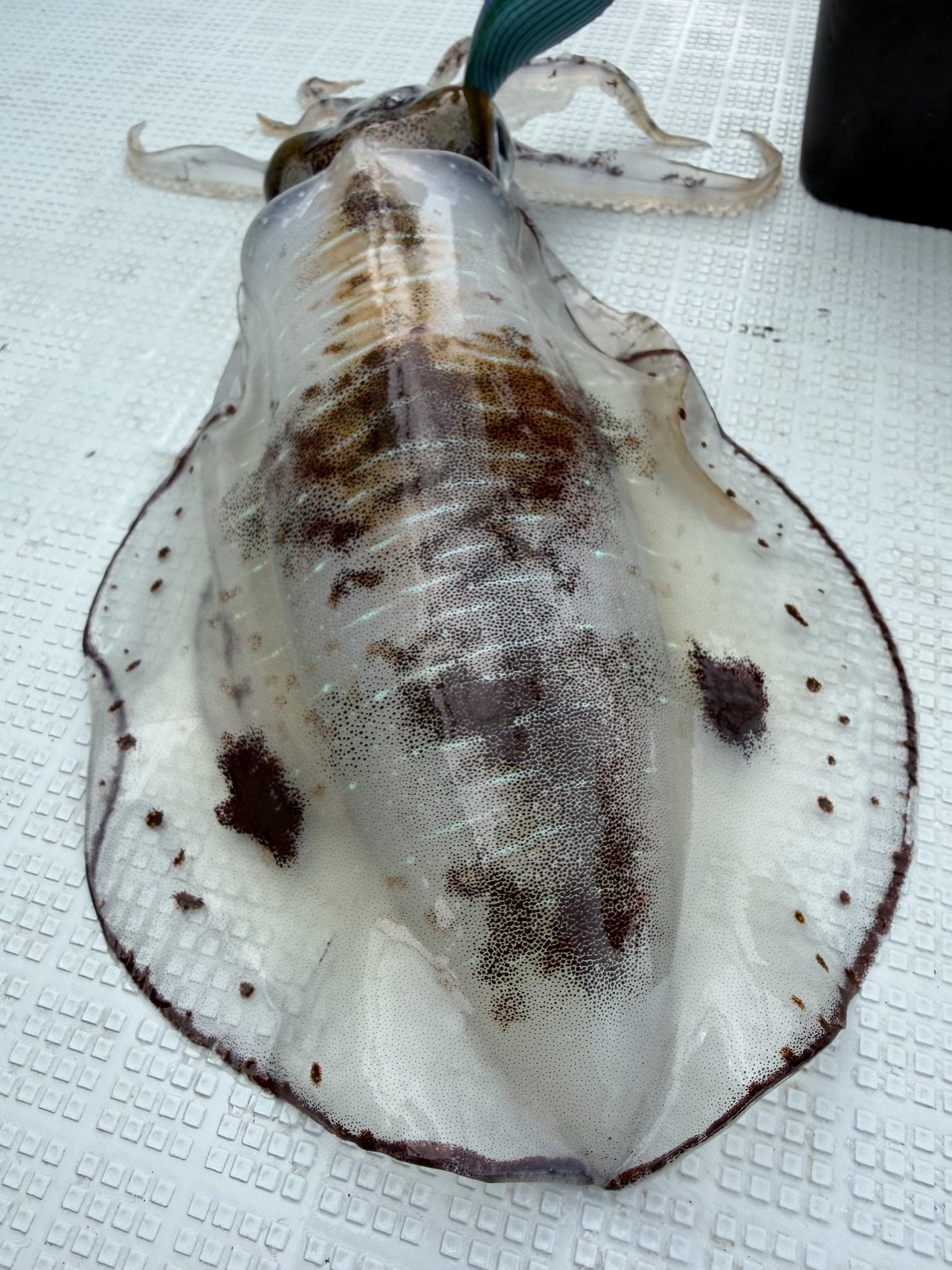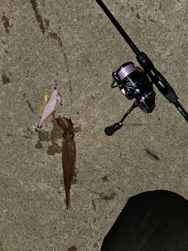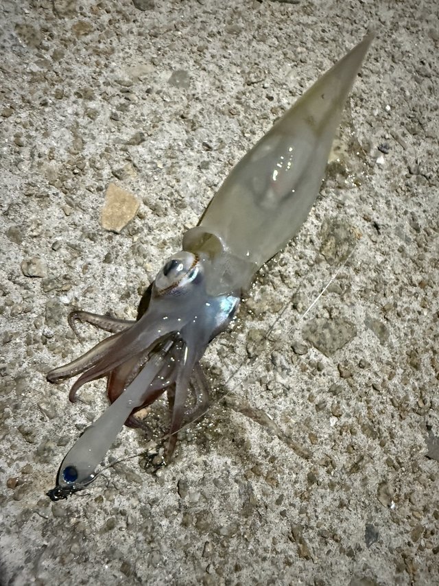 2日目はメンバー少し変わってほぼ同じポイント。潮が流れ出したタイミングで隣の方にヒットするとすぐに続いてようやく私にも400gくらいの白系アオリイカヒット!