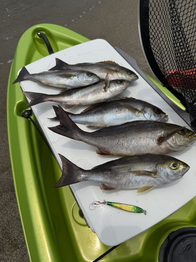 海水浴シーズンでカヤックでは出艇できなくなる前のラストチャンス。朝の潮が動いている時間帯はジギングにて3匹。その後は潮が止まり全く釣れなくなり、コマセ釣りにチェンジ。徐々に入れ喰いモードになり、小型をリリースしつつ20匹以上と、夢中になってたら、熱中症手前…。エサが無くなったから良かったものの、残ってたらまだまだ続けてたかも…
