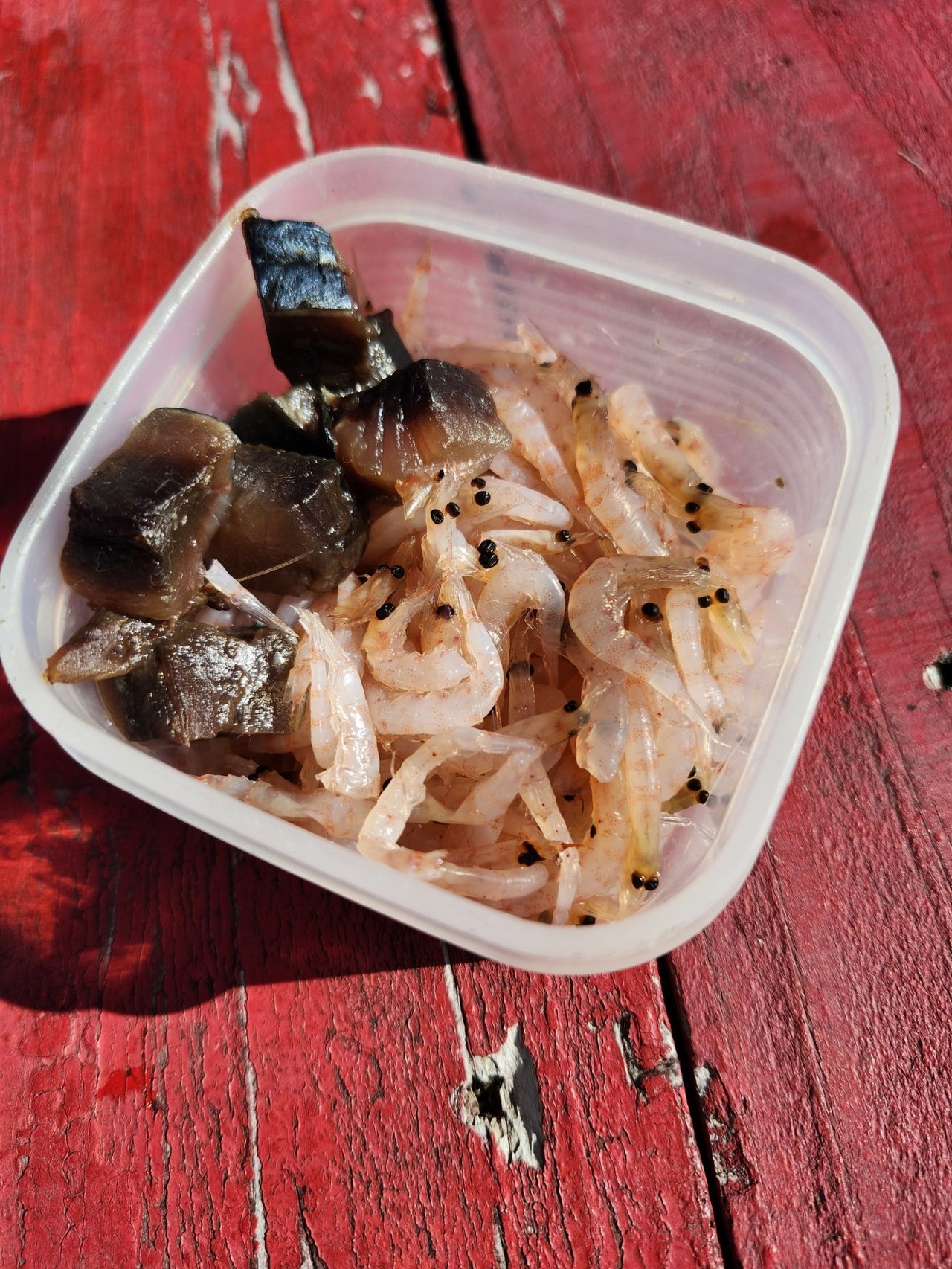 エサはオキアミと、魚の切り身。これを使って、魚を釣り上げる!最後大物が掛かりましたが、竹の竿では太刀打ちできなかったです(笑)