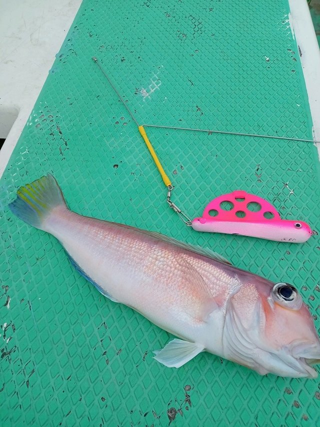 凄く久々のアマダイ釣りだった為、最初は着底→小突き→1メートル上げて待つの基本的な釣り方でスタート。すると開始早々に誘い上げの際にモタレるような違和感からアタリが有り、アマダイ特有の叩くような強烈な引きに良型を確信。慎重に上げてくると40センチ近い良型を無事に取り込めました。