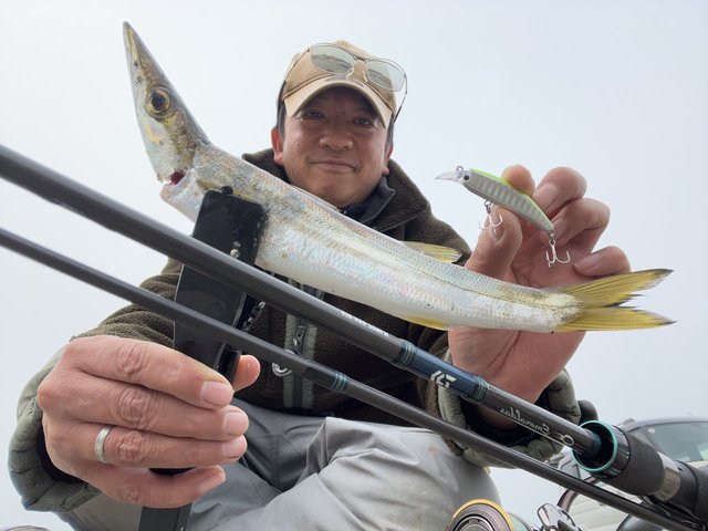 結構湾内入ってんだなぁ、、と思っていると友人のロッドにもヒット!かなり走っていたのでなんだろうとみているとデカめのカマス!やはり薄暗い時間はデカカマス入りますよね。