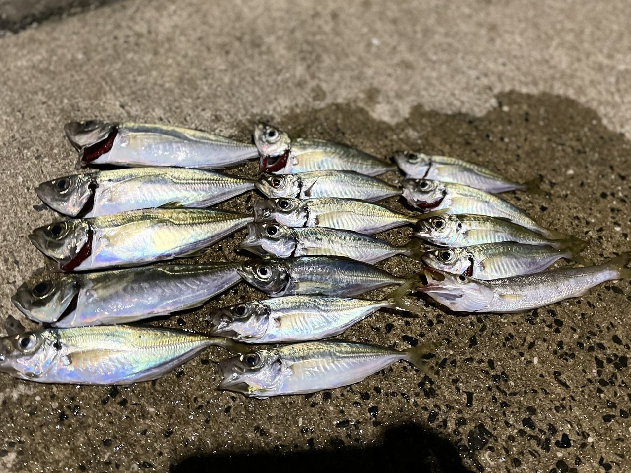 今回は明るいうちからの釣行でしたが足元でもちょい投げでもなんでもアタリがあり、底べったりを攻めればいいサイズのアジが!!