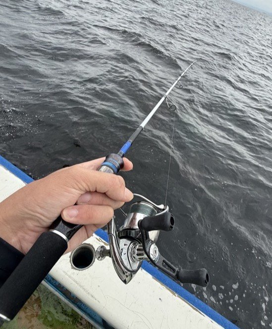 ただ強風で島周りへの出船は出来ず風裏での釣行。ですが、漁師さんたちの網がアオリのポイントに入っているとの事で風裏ポイントもいつもと違う場所からのスタートとなりました。ボートがくるくる回るので夫とは逆方向に投げます。もちろんエギは全く違うカラーを使用!何投かしているとアタリを感じ合わせるも上手く乗らず…回収しエギを確認するとかじられたあとがあり悔しい!!