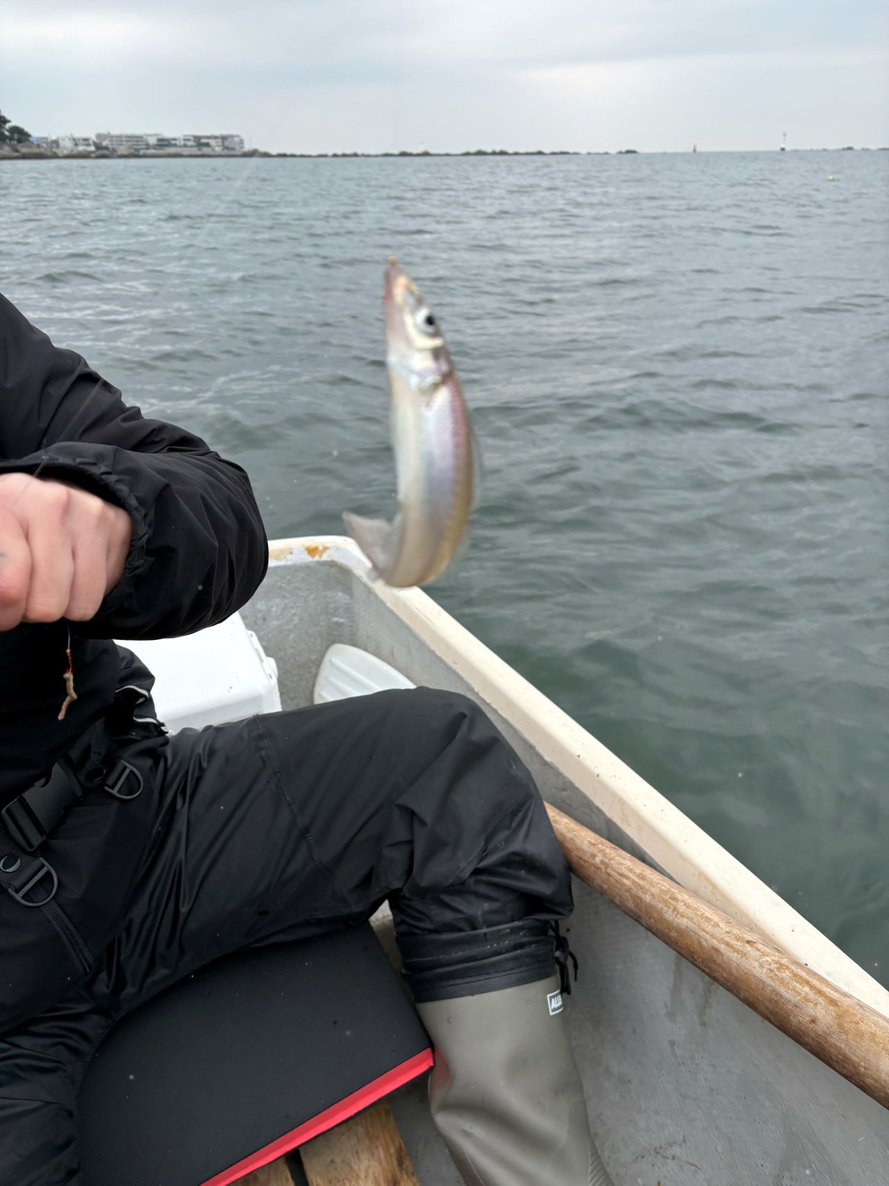 後半、風と波が落ち着いてきたタイミング。釣りやすくなるかな?と思っていたのですがアタリが遠のいてしまい56匹とヒザの青アザで終了。