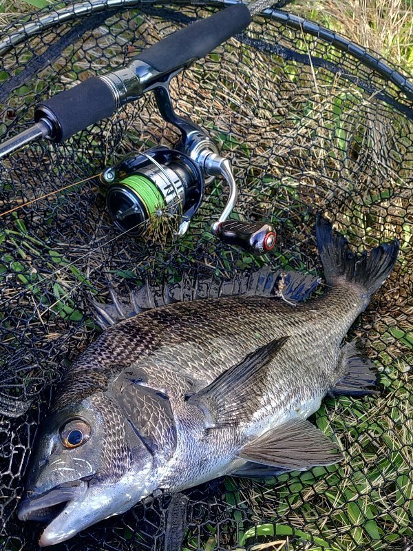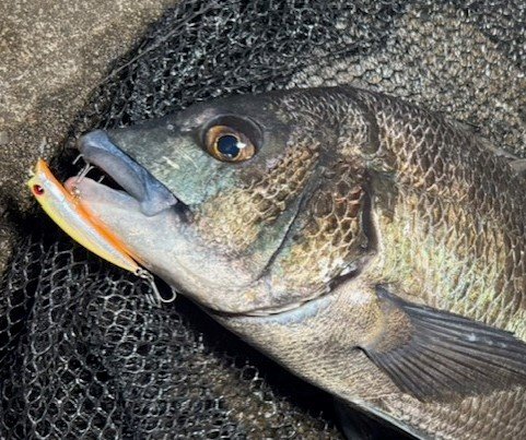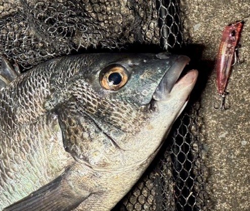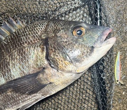 ハゼクラからやってみるとチェイス多数で数尾キャッチ、合間にポコポコ40F投げるとセイゴ連発やチヌのチェイスあるもバイトに至らずでひとまず移動…17時半頃にようやくチヌの反応がありバイト&ヒットで45オーバーキャッチ!