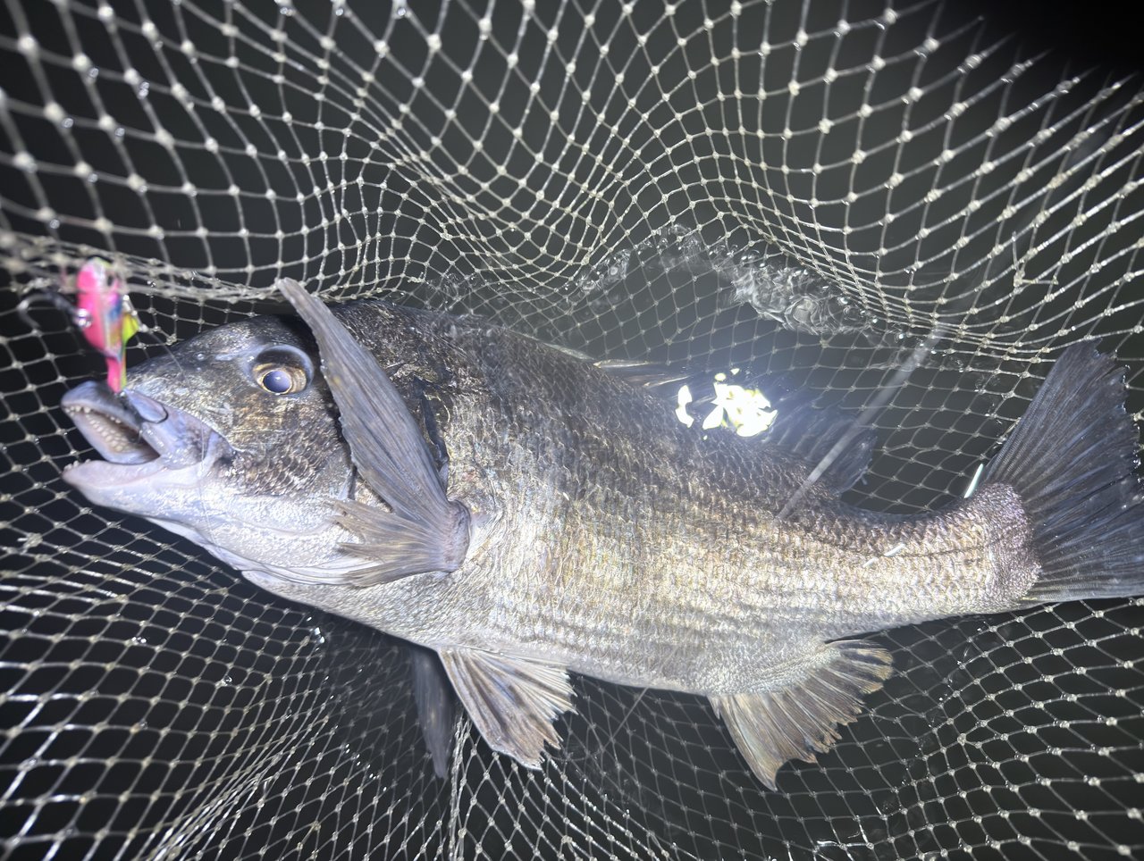ポイントを転々とする中で昨年連発したポイントに入るとこのポイントファーストキャストで着水直後のヒット。ガンガン強い引きから上がってきたのは50センチは届かないものの良型のクロダイ。嬉しいです。