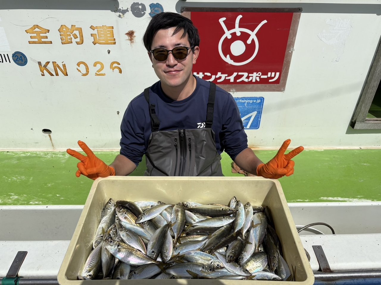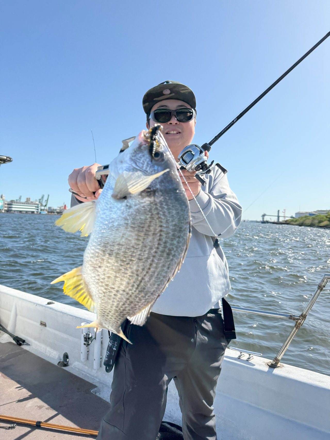 品川シーサイド店の菊地です。この時期のアジが美味しいと聞いたので、お店のスタッフ3名で米元丸さんに行ってきました!時合は短かったけど3点掛けもできたし、サイズも30cmくらいの子が釣れました。途中トラフグも顔を出してくれました。ラストの投入でクロダイがかかり、ハリス1.2でヒヤヒヤしましたが無事引き上げることが出来ました。